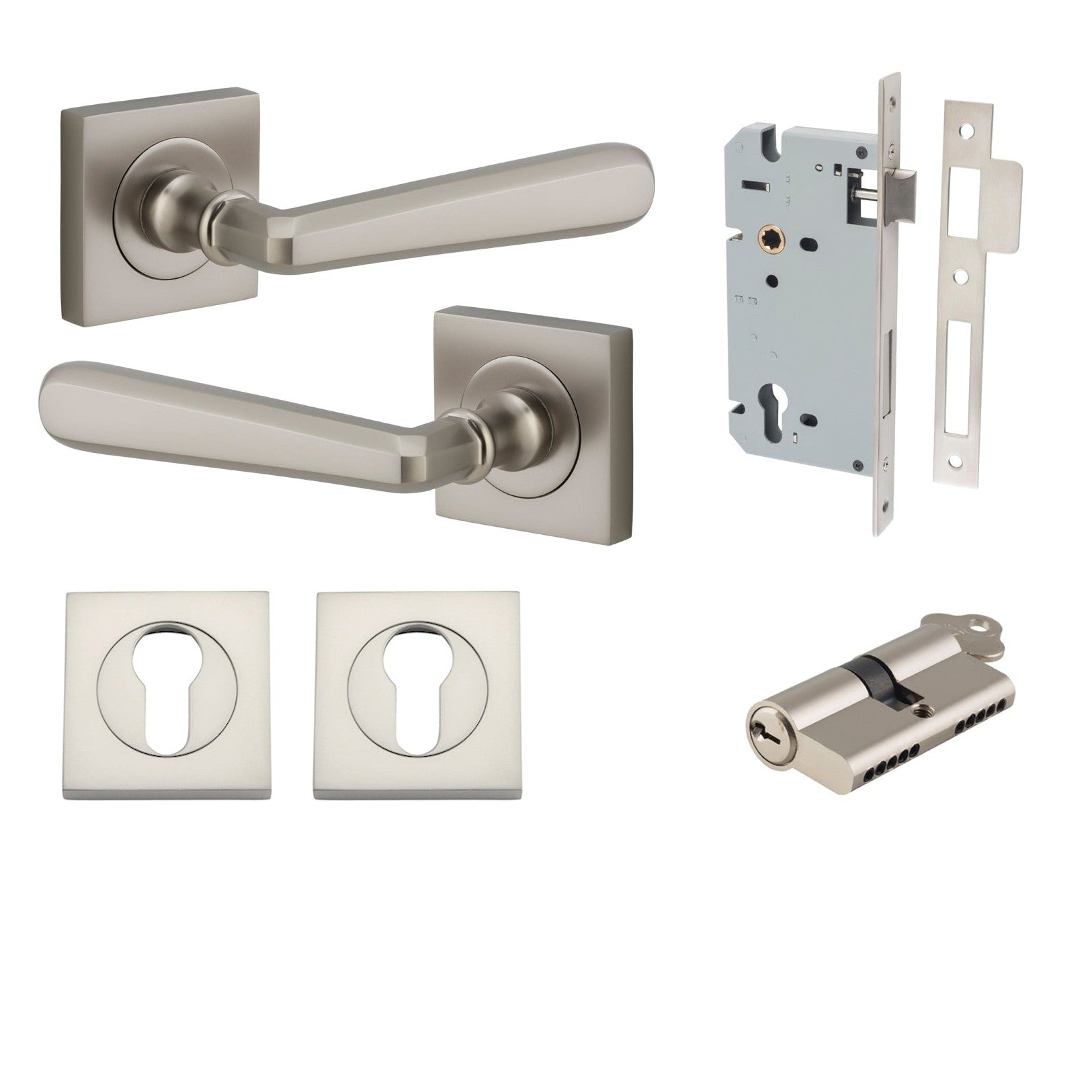 Included in Kit: Door Lever Copenhagen Square Rose Satin Nickel H52xW52xP61mm Entrance Kit, Mortice Lock Euro Satin Nickel CTC85mm Backset 60mm, Euro Cylinder Dual Function 5 Pin Satin Nickel L65mm KA1, Escutcheon Euro Concealed Fix Square Pair Satin Nickel H52xW52xP10mm