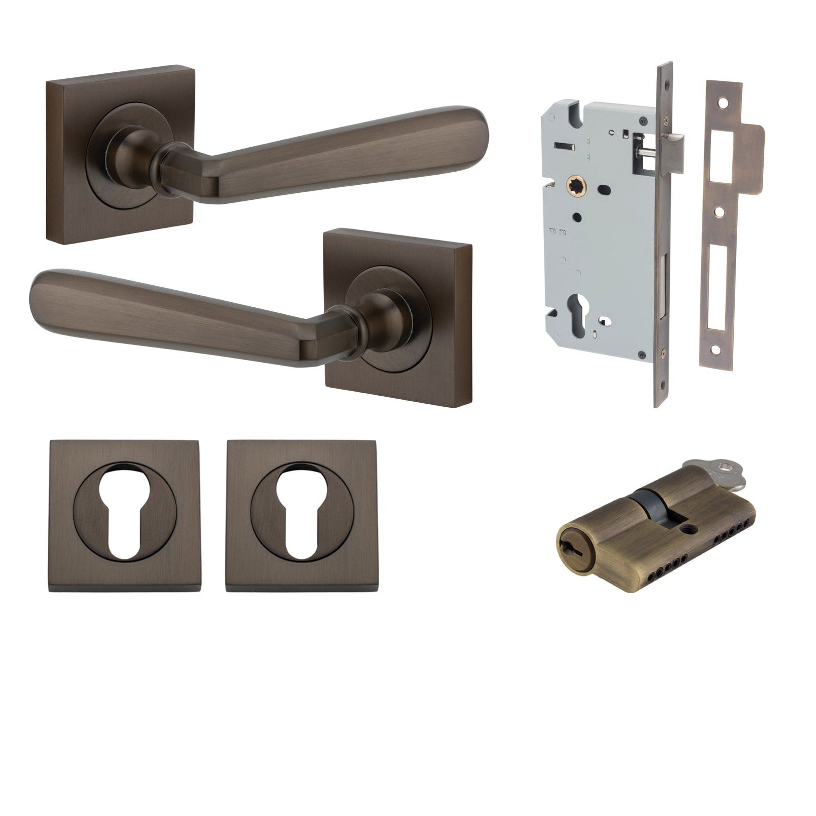 Included in Kit: Door Lever Copenhagen Square Rose Signature Brass H52xW52xP61mm Entrance Kit, Mortice Lock Euro Signature Brass CTC85mm Backset 60mm, Euro Cylinder Dual Function 5 Pin Polished Brass L65mm KA1, Escutcheon Euro Concealed Fix Square Pair Signature Brass H52xW52xP10mm