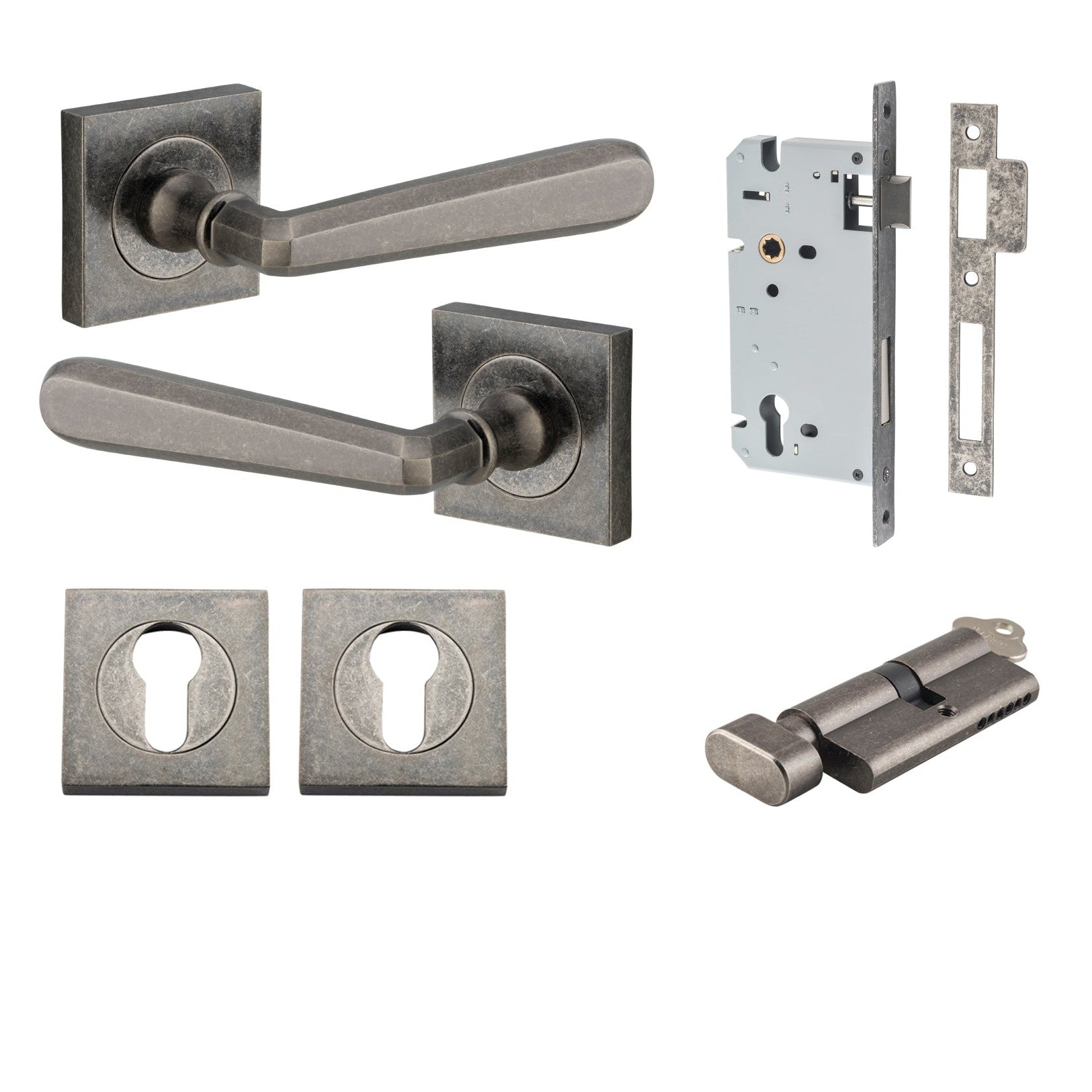 Included in Kit: Door Lever Copenhagen Square Rose Distressed Nickel H52xW52xP61mm Entrance Kit, Mortice Lock Euro Distressed Nickel CTC85mm Backset 60mm, Euro Cylinder Key Thumb 6 Pin Distressed Nickel L70mm KA1, Escutcheon Euro Concealed Fix Square Pair Distressed Nickel H52xW52xP10mm