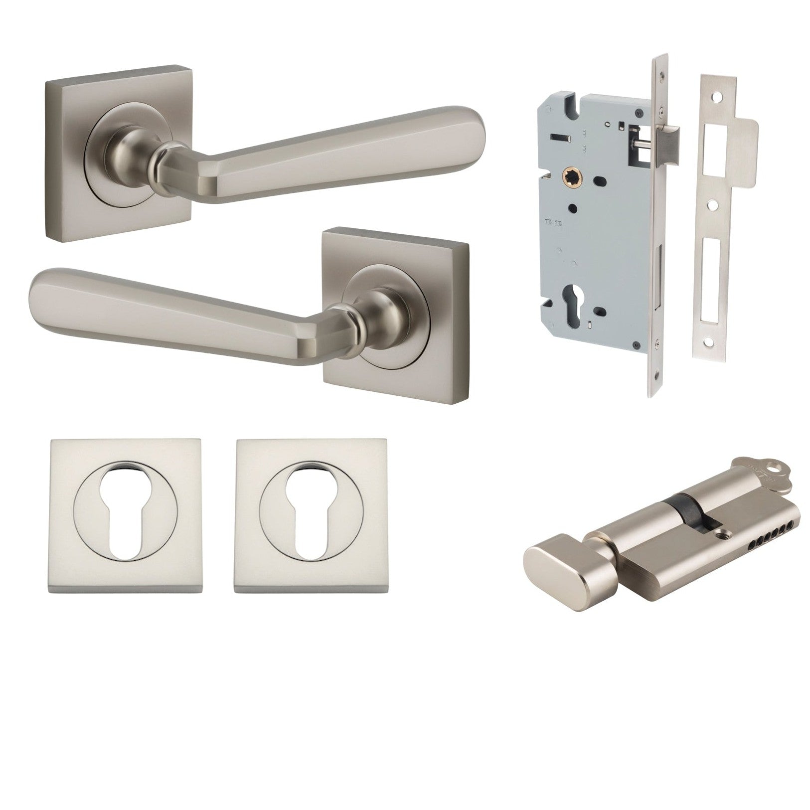 Included in Kit: Door Lever Copenhagen Square Rose Satin Nickel H52xW52xP61mm Entrance Kit, Mortice Lock Euro Satin Nickel CTC85mm Backset 60mm, Euro Cylinder Key Thumb 6 Pin Satin Nickel L70mm KA1, Escutcheon Euro Concealed Fix Square Pair Satin Nickel H52xW52xP10mm