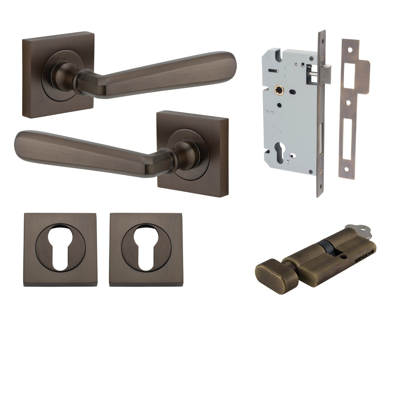 Included in Kit: Door Lever Copenhagen Square Rose Signature Brass H52xW52xP61mm Entrance Kit, Mortice Lock Euro Signature Brass CTC85mm Backset 60mm, Euro Cylinder Key Thumb 6 Pin Signature Brass L70mm KA1, Escutcheon Euro Concealed Fix Square Pair Signature Brass H52xW52xP10mm