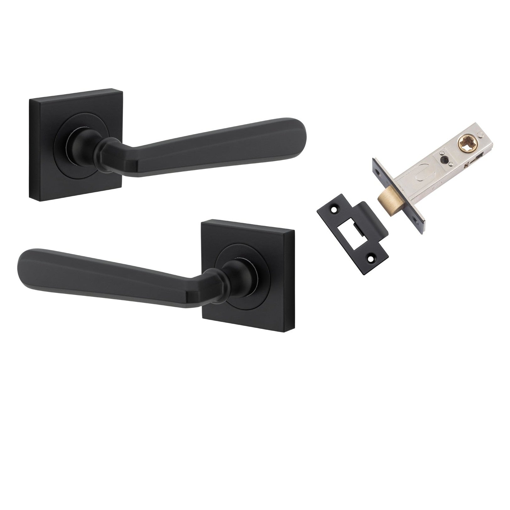 Included in Kit: Door Lever Copenhagen Square Rose Matt Black H52xW52xP61mm Passage Kit, Tube Latch Split Cam 'T' Striker Matt Black Backset 60mm