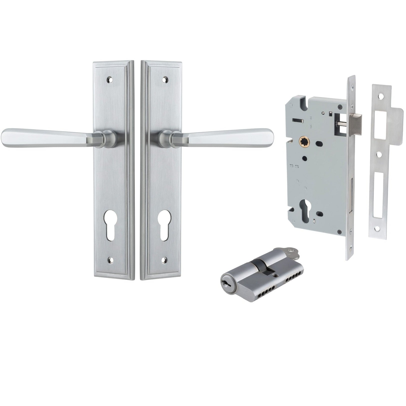 Included in Kit: Door Lever Copenhagen Stepped Euro Pair Brushed Chrome CTC85mm H237xW50xP61mm Entrance Kit, Mortice Lock Euro Brushed Chrome CTC85mm Backset 60mm, Euro Cylinder Dual Function 5 Pin Brushed Chrome L65mm KA1