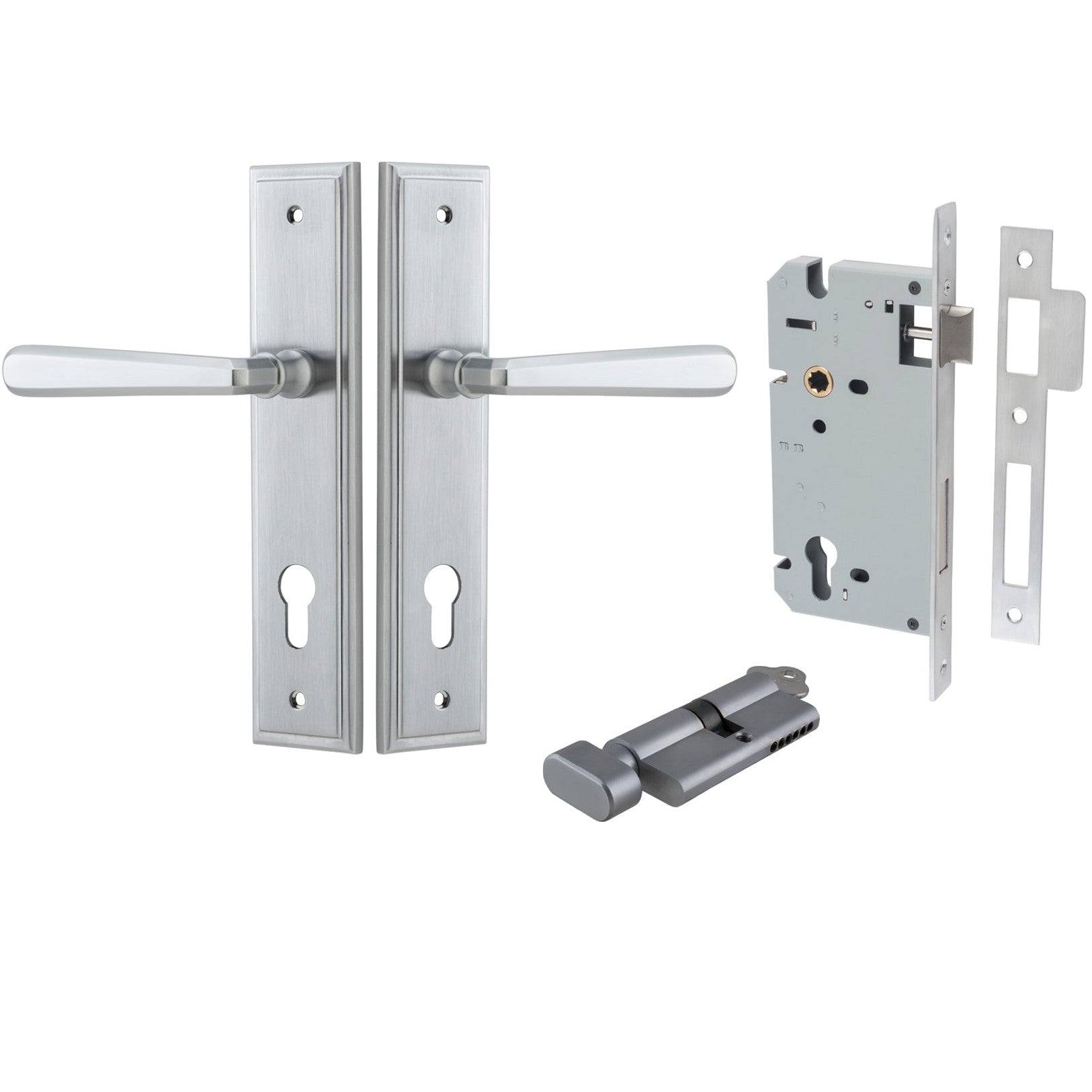 Included in Kit: Door Lever Copenhagen Stepped Euro Pair Brushed Chrome CTC85mm H237xW50xP61mm Entrance Kit, Mortice Lock Euro Brushed Chrome CTC85mm Backset 60mm, Euro Cylinder Key Thumb 6 Pin Brushed Chrome L70mm KA1