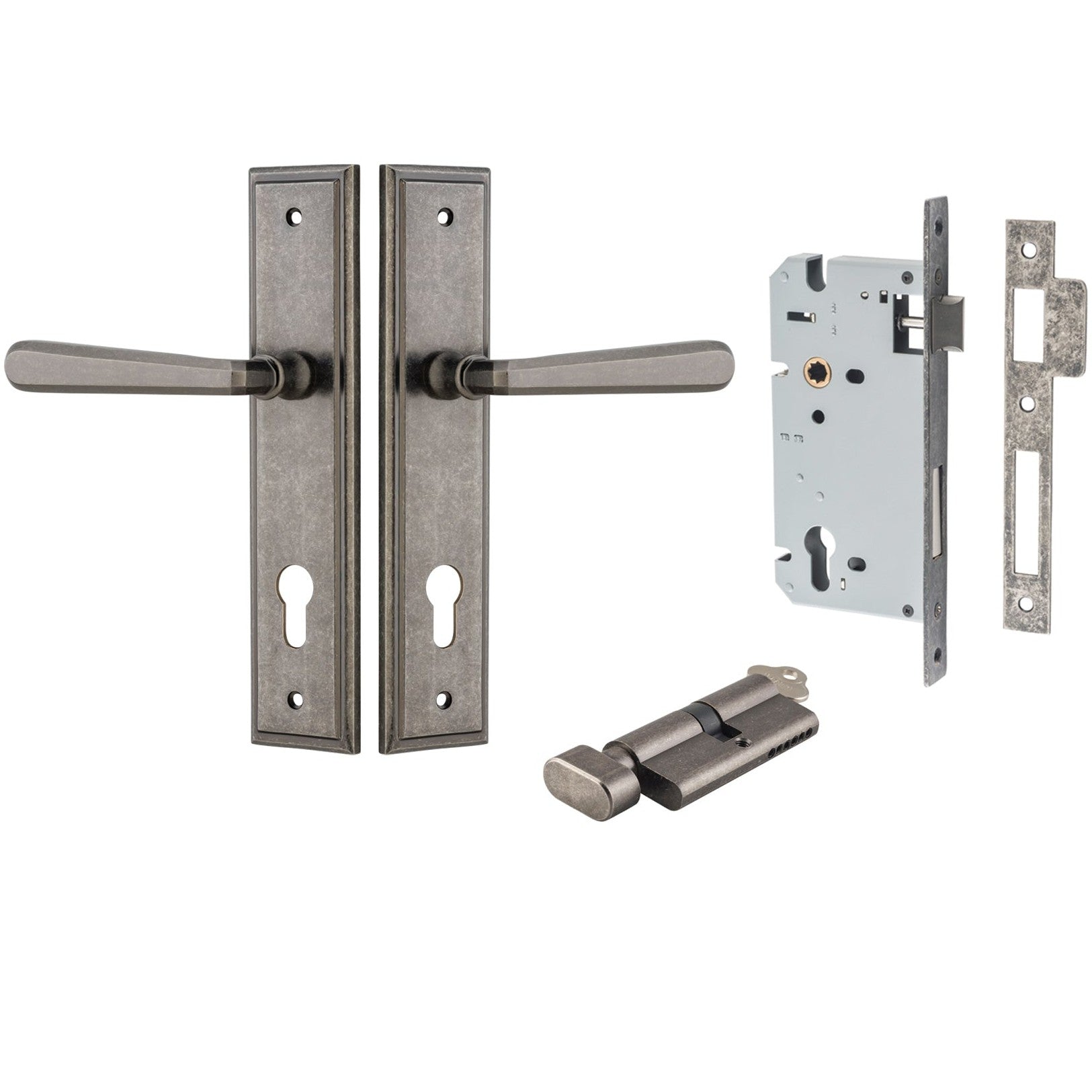 Included in Kit: Door Lever Copenhagen Stepped Euro Pair Distressed Nickel CTC85mm H237xW50xP61mm Entrance Kit, Mortice Lock Euro Distressed Nickel CTC85mm Backset 60mm, Euro Cylinder Key Thumb 6 Pin Distressed Nickel L70mm KA1