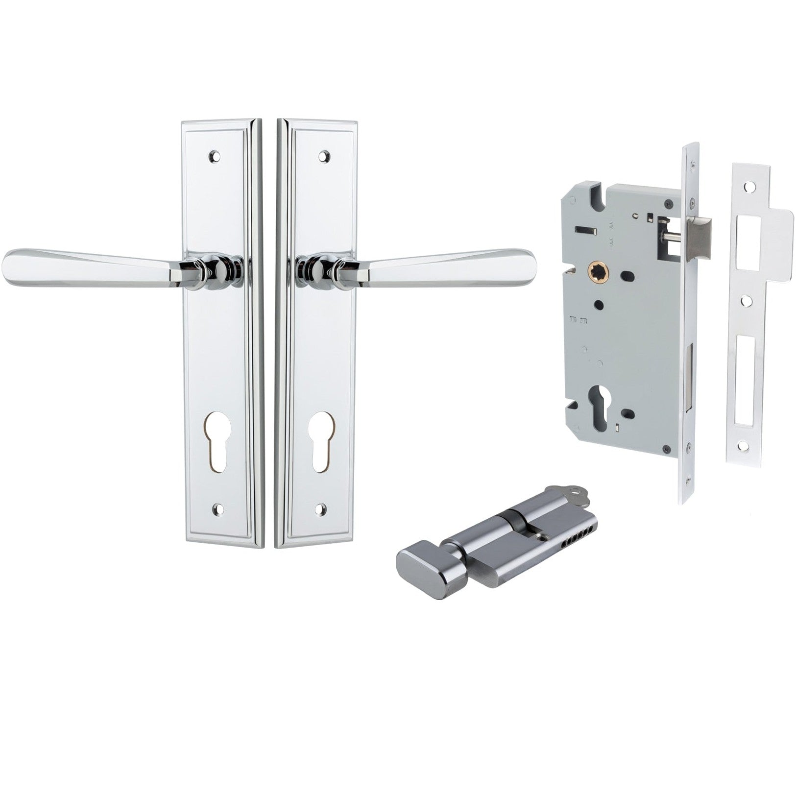 Included in Kit: Door Lever Copenhagen Stepped Euro Pair Polished Chrome CTC85mm H237xW50xP61mm Entrance Kit, Mortice Lock Euro Polished Chrome CTC85mm Backset 60mm, Euro Cylinder Key Thumb 6 Pin Polished Chrome L70mm KA1