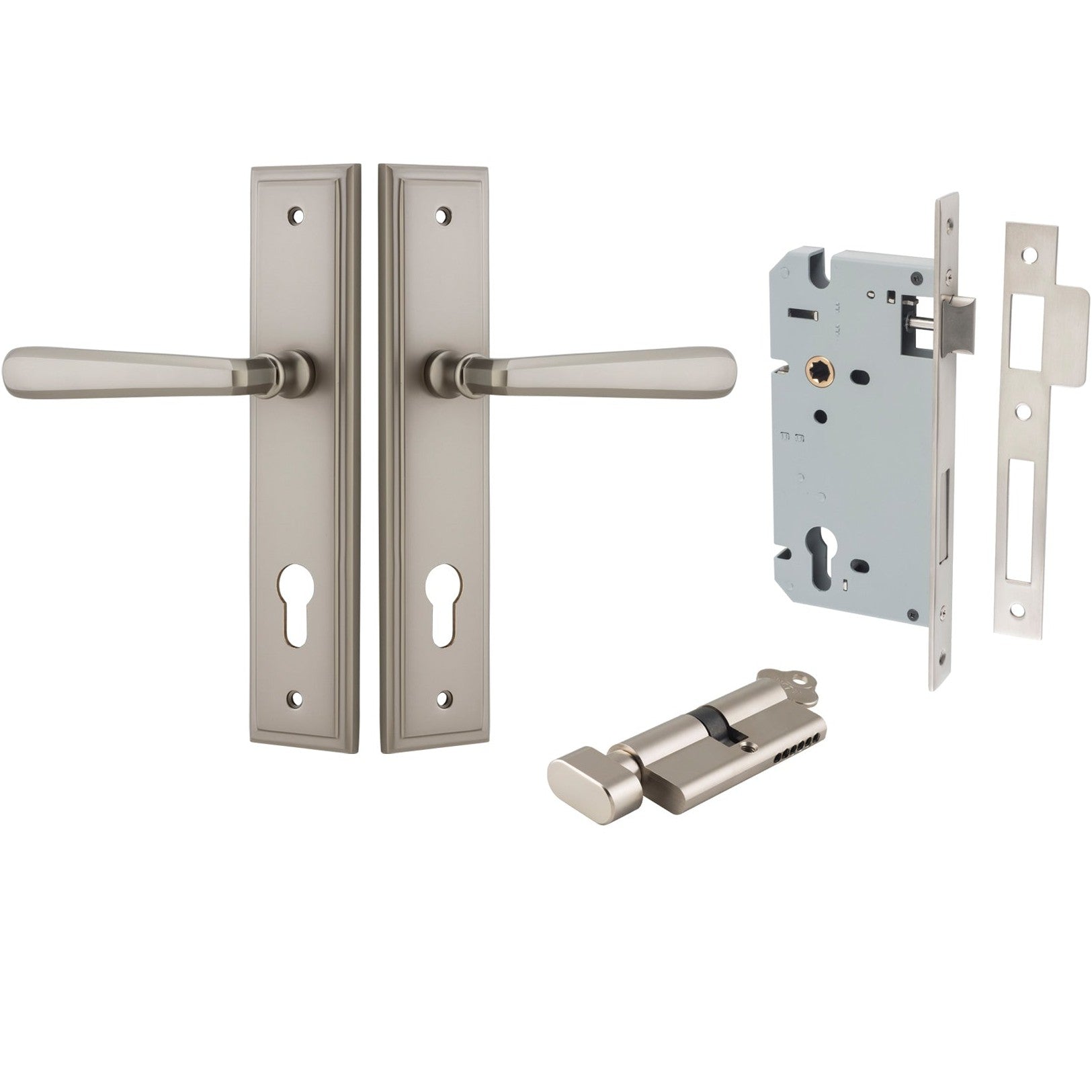 Included in Kit: Door Lever Copenhagen Stepped Euro Pair Satin Nickel CTC85mm H237xW50xP61mm Entrance Kit, Mortice Lock Euro Satin Nickel CTC85mm Backset 60mm, Euro Cylinder Key Thumb 6 Pin Satin Nickel L70mm KA1