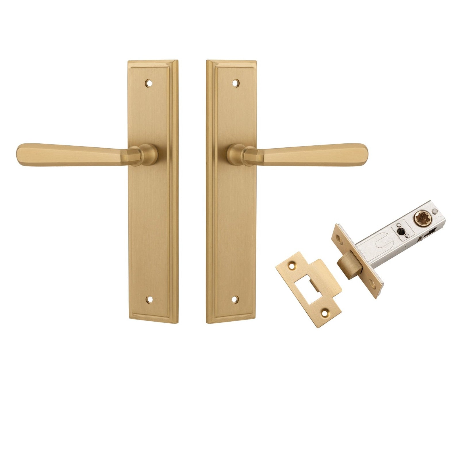 Included in Kit: Door Lever Copenhagen Stepped Latch Pair Brushed Brass H237xW50xP61mm Passage Kit, Tube Latch Split Cam 'T' Striker Brushed Brass Backset 60mm
