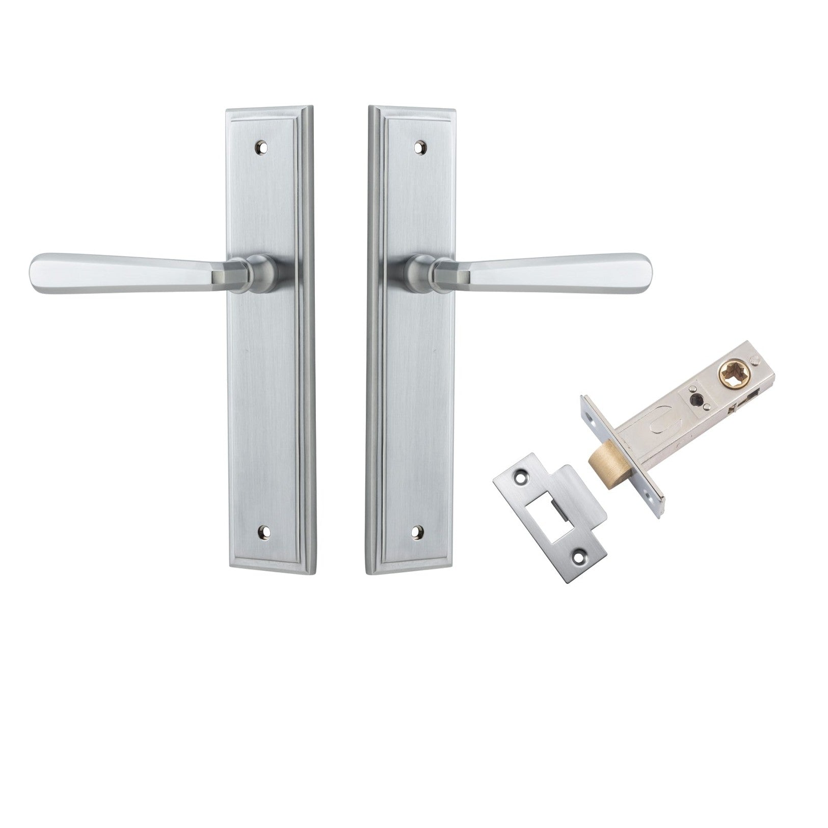 Included in Kit: Door Lever Copenhagen Stepped Latch Pair Brushed Chrome H237xW50xP61mm Passage Kit, Tube Latch Split Cam 'T' Striker Brushed Chrome Backset 60mm