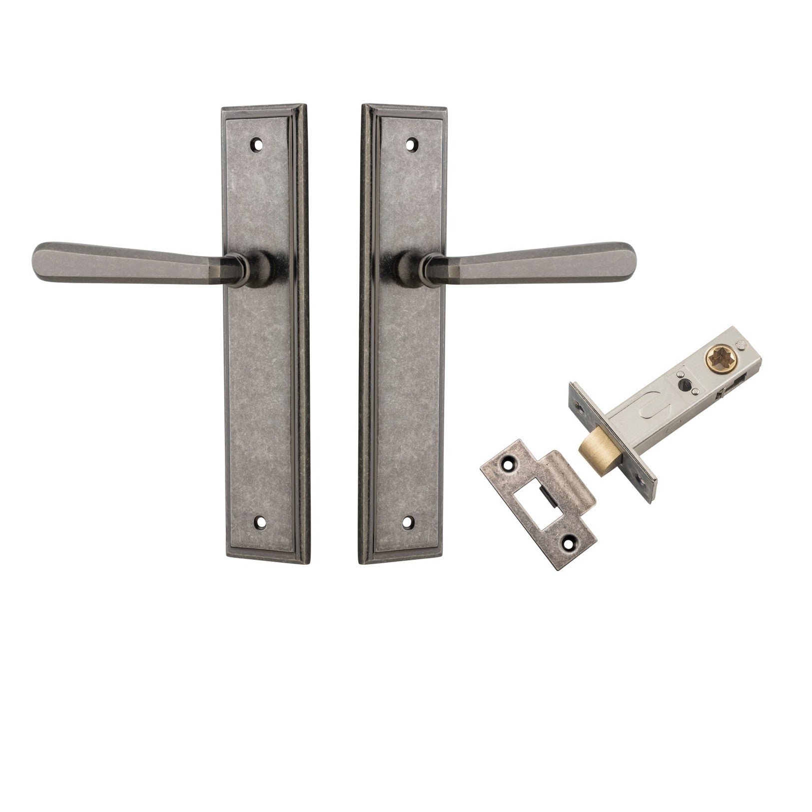 Included in Kit: Door Lever Copenhagen Stepped Latch Pair Distressed Nickel H237xW50xP61mm Passage Kit, Tube Latch Split Cam 'T' Striker Distressed Nickel Backset 60mm