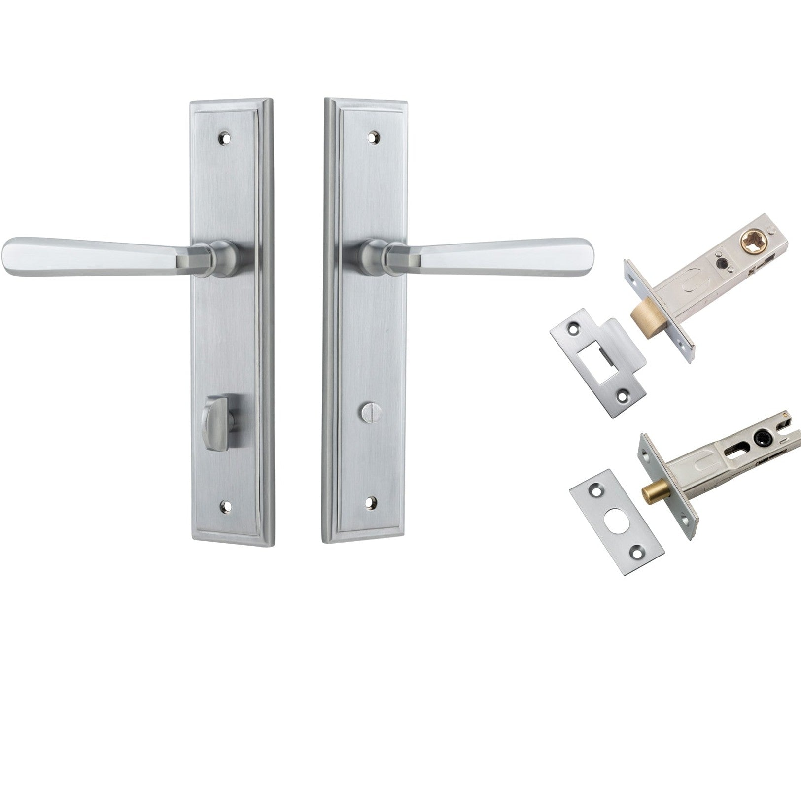 Included in Kit: Door Lever Copenhagen Stepped Privacy Pair Brushed Chrome CTC85mm H237xW50xP61mm Inbuilt Privacy Kit, Tube Latch Split Cam 'T' Striker Brushed Chrome Backset 60mm, Privacy Bolt Round Bolt Brushed Chrome Backset 60mm