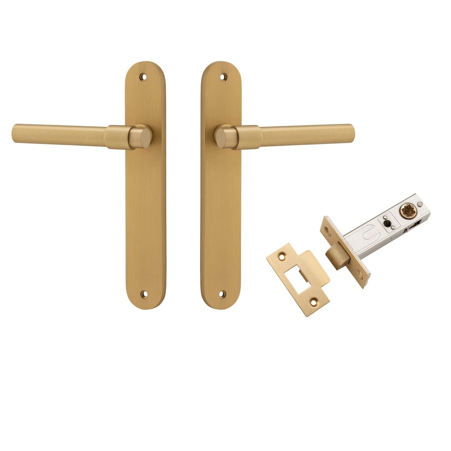Included in Kit: Door Lever Helsinki Oval Latch Pair Brushed Brass H240xW40xP44mm Passage Kit, Tube Latch Split Cam 'T' Striker Brushed Brass Backset 60mm