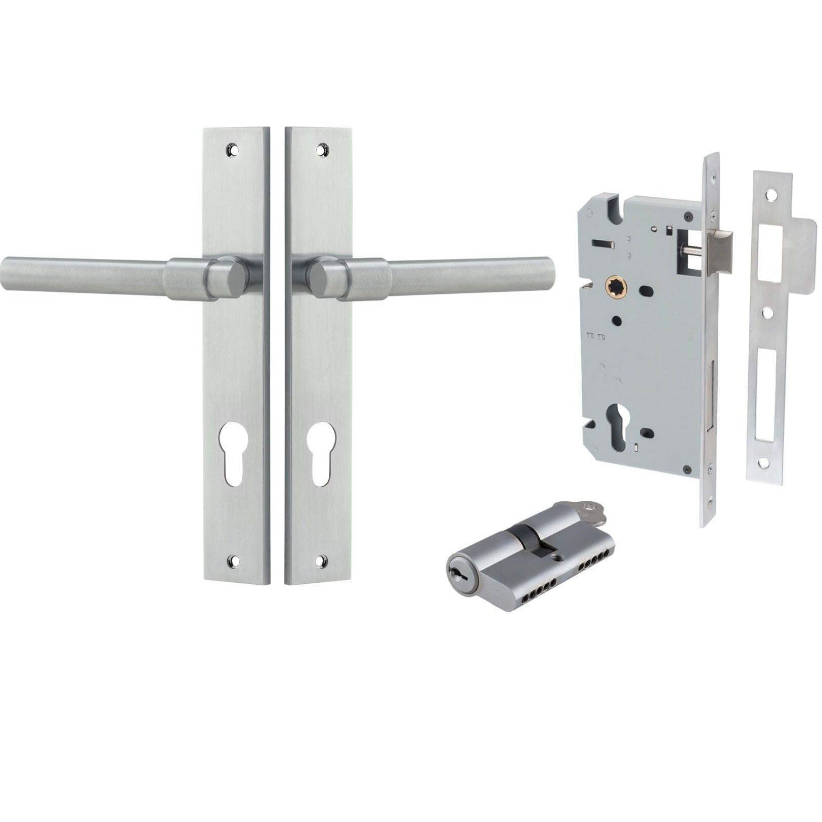 Included in Kit: Door Lever Helsinki Rectangular Euro Pair Brushed Chrome CTC85mm H240xW38xP44mm Entrance Kit, Mortice Lock Euro Brushed Chrome CTC85mm Backset 60mm, Euro Cylinder Dual Function 5 Pin Brushed Chrome L65mm KA1