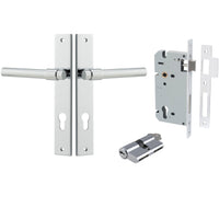 Included in Kit: Door Lever Helsinki Rectangular Euro Pair Polished Chrome CTC85mm H240xW38xP44mm Entrance Kit, Mortice Lock Euro Polished Chrome CTC85mm Backset 60mm, Euro Cylinder Dual Function 5 Pin Polished Chrome L65mm KA1