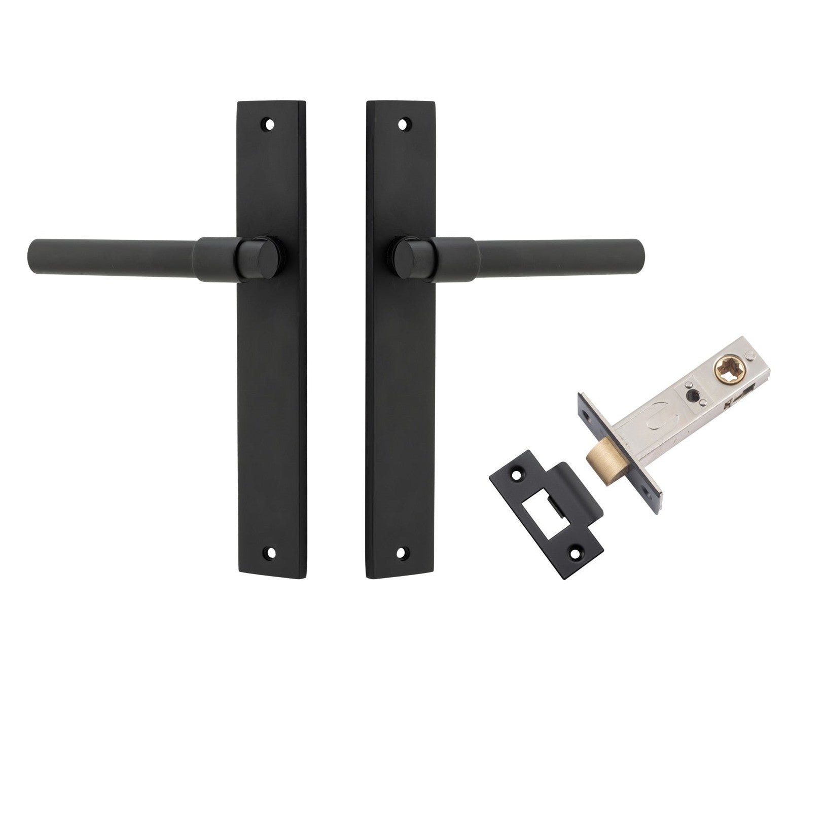 Included in Kit: Door Lever Helsinki Rectangular Latch Pair Matt Black H240xW38xP44mm Passage Kit, Tube Latch Split Cam 'T' Striker Matt Black Backset 60mm
