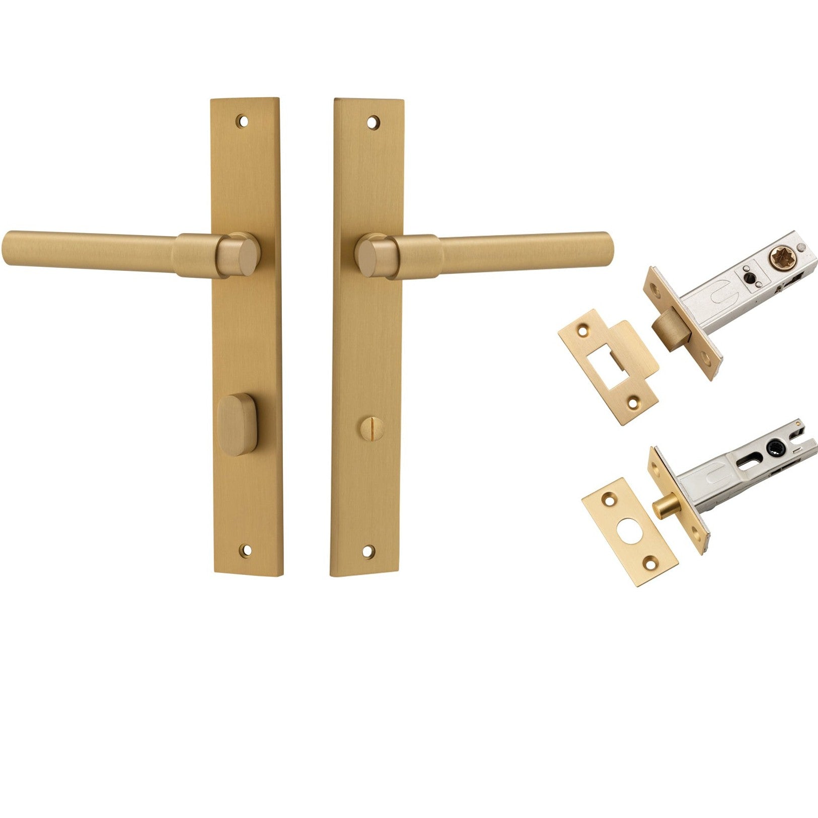 Included in Kit: Door Lever Helsinki Rectangular Privacy Pair Brushed Brass CTC85mm H240xW38xP44mm Inbuilt Privacy Kit, Tube Latch Split Cam 'T' Striker Brushed Brass Backset 60mm, Privacy Bolt Round Bolt Brushed Brass Backset 60mm
