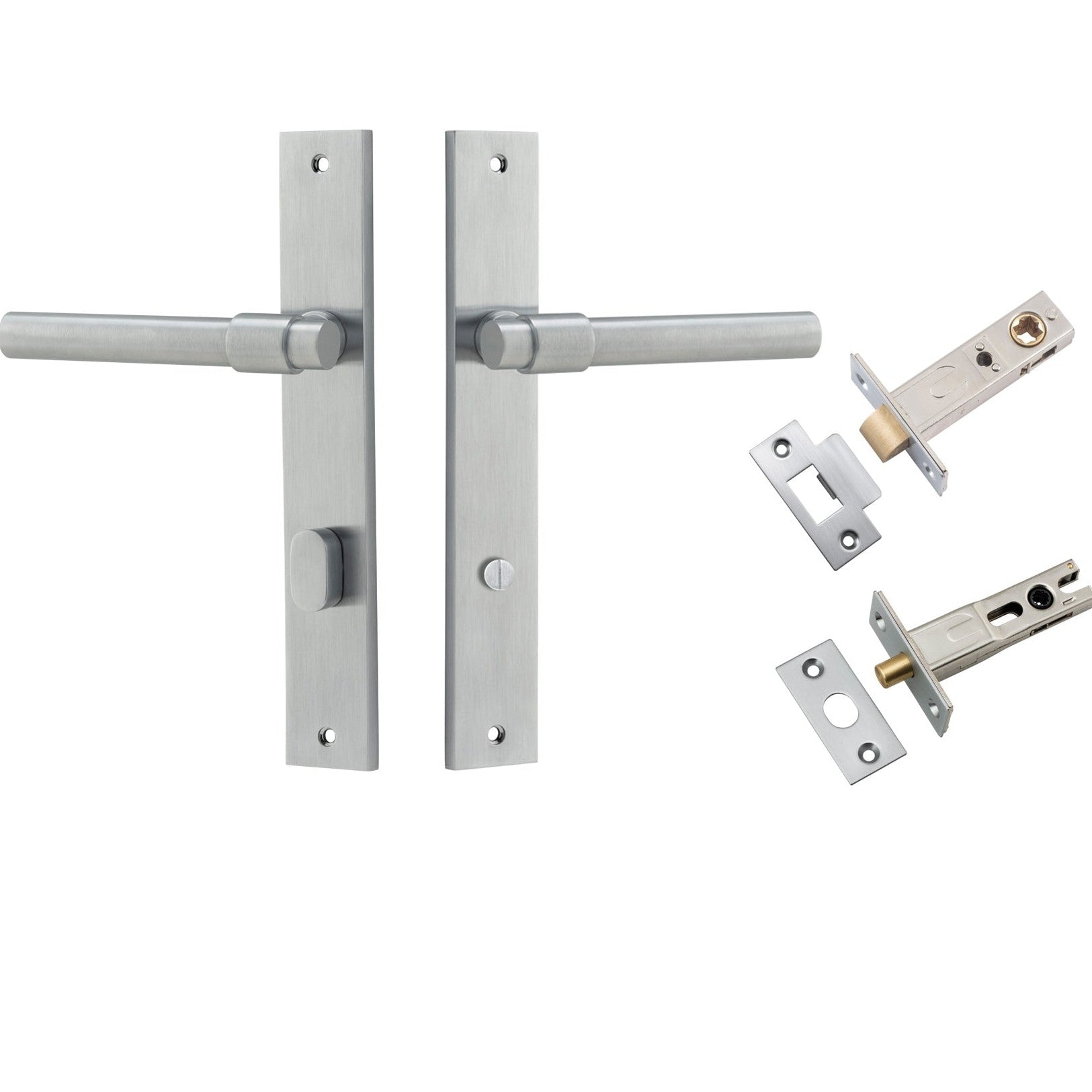 Included in Kit: Door Lever Helsinki Rectangular Privacy Pair Brushed Chrome CTC85mm H240xW38xP44mm Inbuilt Privacy Kit, Tube Latch Split Cam 'T' Striker Brushed Chrome Backset 60mm, Privacy Bolt Round Bolt Brushed Chrome Backset 60mm