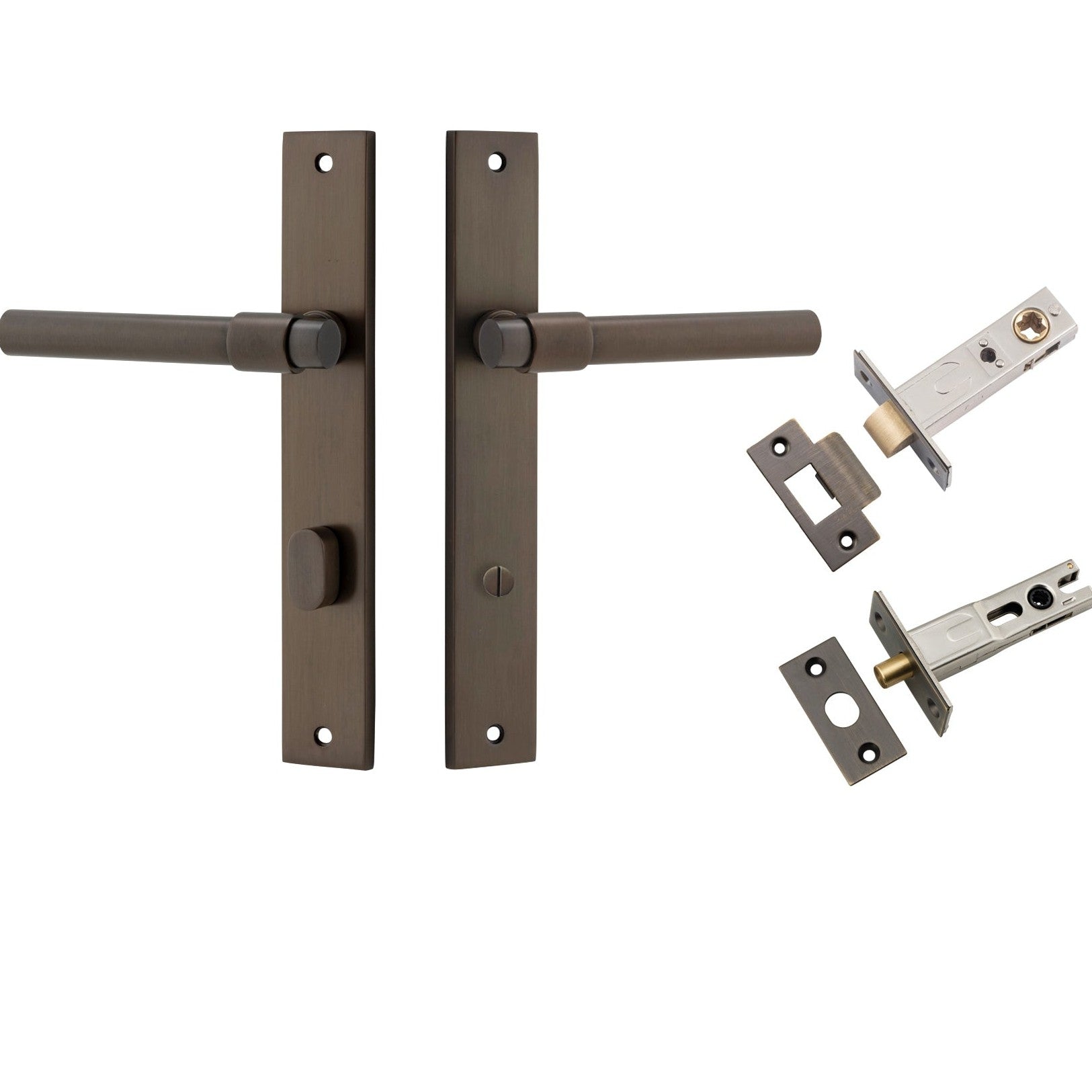 Included in Kit: Door Lever Helsinki Rectangular Privacy Pair Signature Brass CTC85mm H240xW38xP44mm Inbuilt Privacy Kit, Tube Latch Split Cam 'T' Striker Signature Brass Backset 60mm, Privacy Bolt Round Bolt Signature Brass Backset 60mm