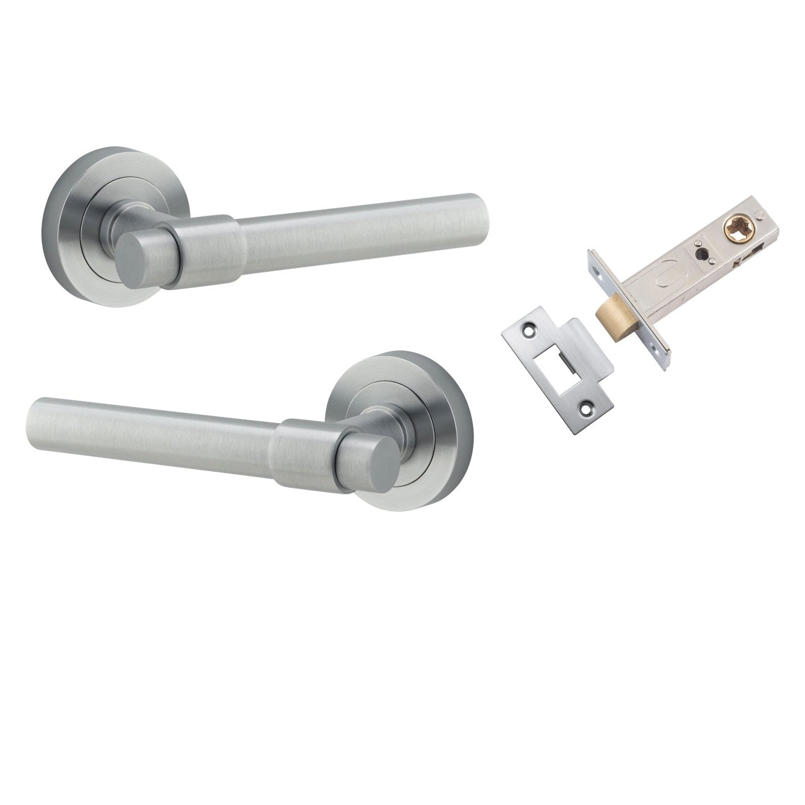 Included in Kit: Door Lever Helsinki Round Rose Brushed Chrome D52xP44mm Passage Kit, Tube Latch Split Cam 'T' Striker Brushed Chrome Backset 60mm