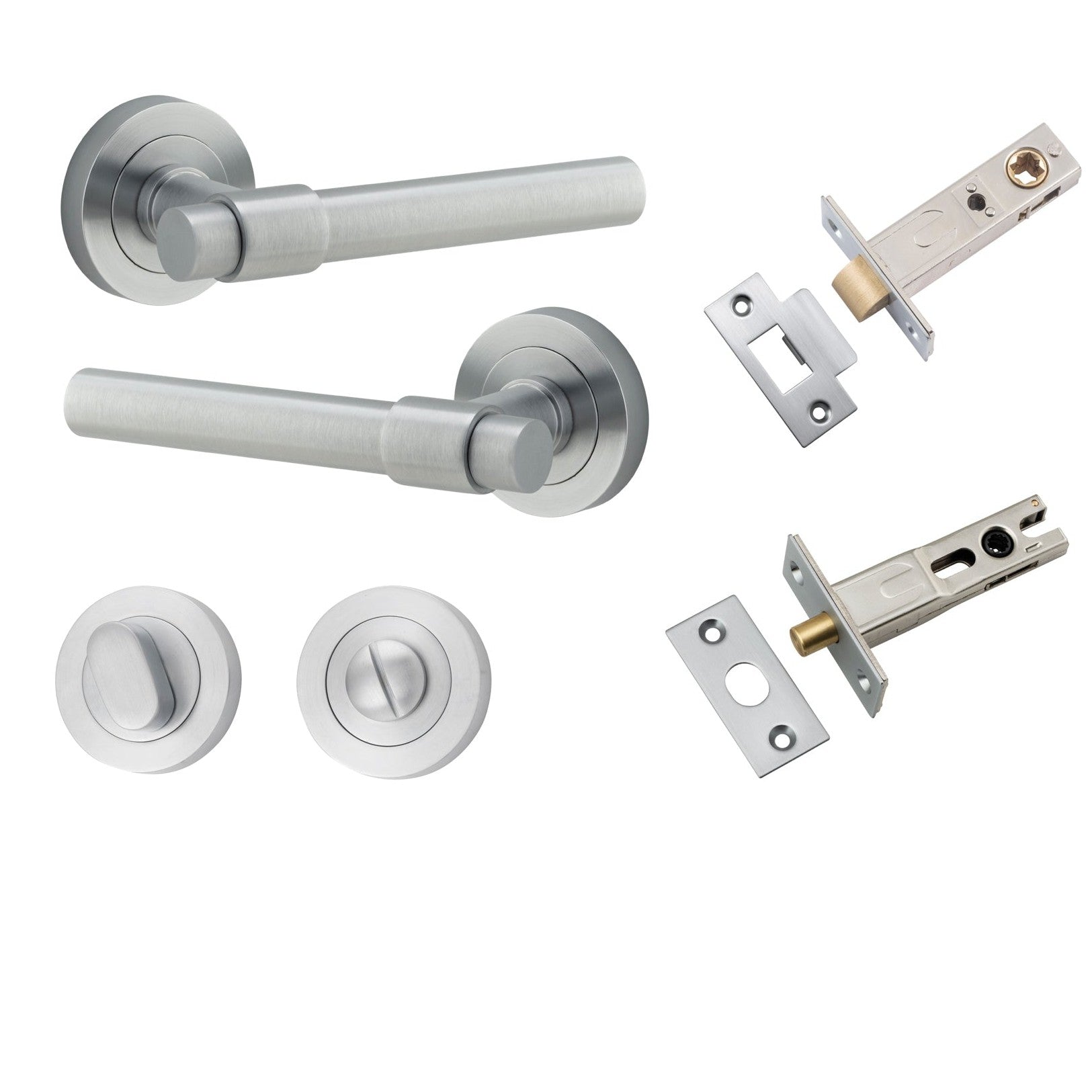 Included in Kit: Door Lever Helsinki Round Rose Brushed Chrome D52xP44mm Privacy Kit, Tube Latch Split Cam 'T' Striker Brushed Chrome Backset 60mm, Privacy Bolt Round Bolt Brushed Chrome Backset 60mm, Privacy Turn Oval Concealed Fix Round Brushed Chrome D52xP23mm