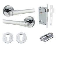 Included in Kit: Door Lever Helsinki Round Rose Polished Chrome D52xP44mm Entrance Kit, Mortice Lock Euro Polished Chrome CTC85mm Backset 60mm, Euro Cylinder Dual Function 5 Pin Polished Chrome L65mm KA1, Escutcheon Euro Concealed Fix Round Pair Polished Chrome D52xP10mm