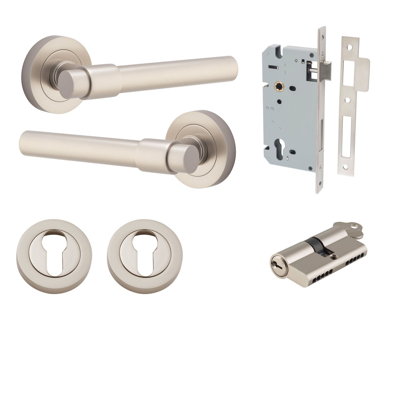 Included in Kit: Door Lever Helsinki Round Rose Satin Nickel D52xP44mm Entrance Kit, Mortice Lock Euro Satin Nickel CTC85mm Backset 60mm, Euro Cylinder Dual Function 5 Pin Satin Nickel L65mm KA1, Escutcheon Euro Concealed Fix Round Pair Satin Nickel D52xP10mm