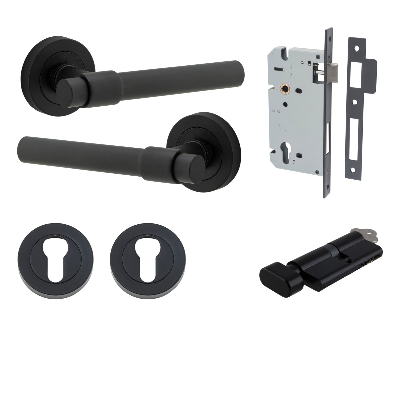 Included in Kit: Door Lever Helsinki Round Rose Matt Black D52xP44mm Entrance Kit, Mortice Lock Euro Matt Black CTC85mm Backset 60mm, Euro Cylinder Key Thumb 6 Pin Matt Black L70mm KA1, Escutcheon Euro Concealed Fix Round Pair Matt Black D52xP10mm