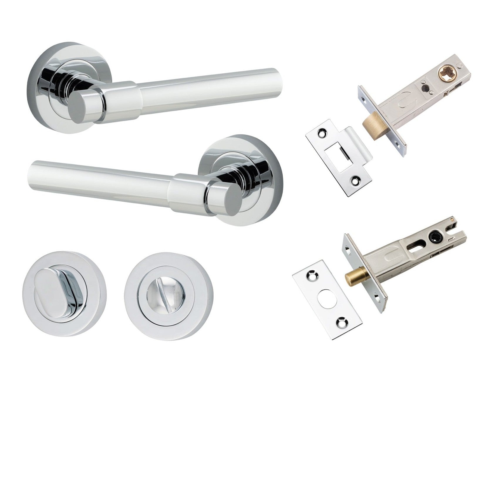 Included in Kit: Door Lever Helsinki Round Rose Polished Chrome D52xP44mm Privacy Kit, Tube Latch Split Cam 'T' Striker Polished Chrome Backset 60mm, Privacy Bolt Round Bolt Polished Chrome Backset 60mm, Privacy Turn Oval Concealed Fix Round Polished Chrome D52xP23mm