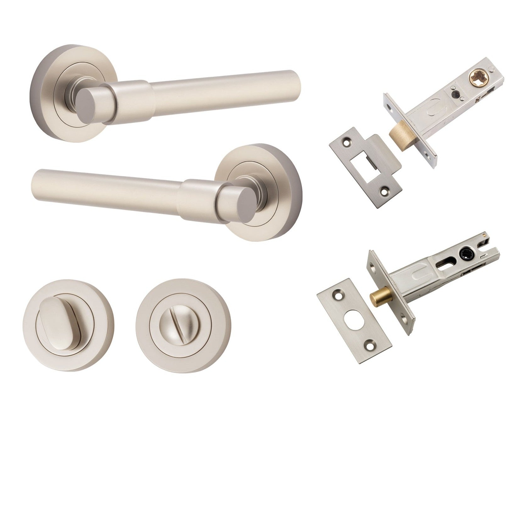 Included in Kit: Door Lever Helsinki Round Rose Satin Nickel D52xP44mm Privacy Kit, Tube Latch Split Cam 'T' Striker Satin Nickel Backset 60mm, Privacy Bolt Round Bolt Satin Nickel Backset 60mm, Privacy Turn Oval Concealed Fix Round Satin Nickel D52xP23mm
