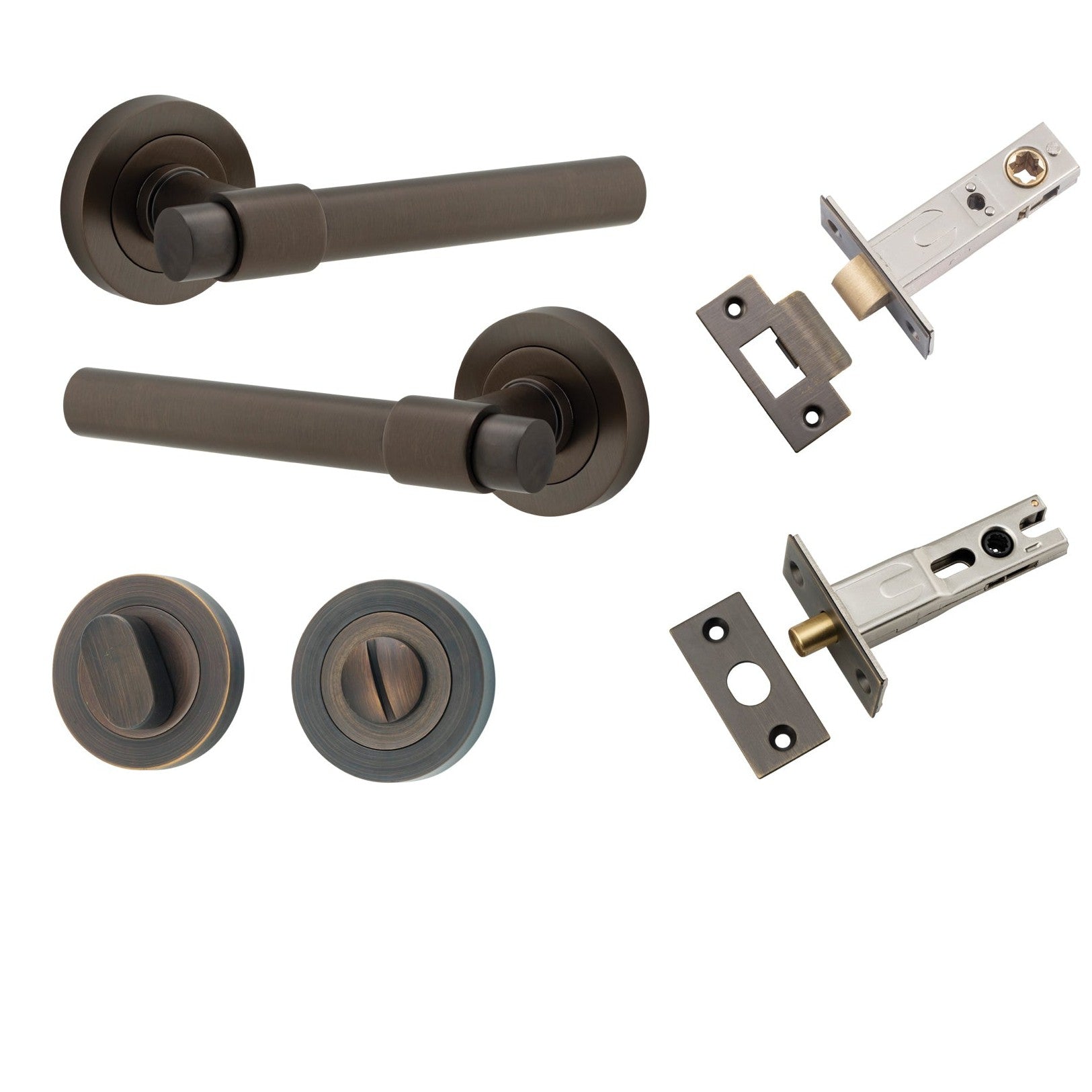Included in Kit: Door Lever Helsinki Round Rose Signature Brass D52xP44mm Privacy Kit, Tube Latch Split Cam 'T' Striker Signature Brass Backset 60mm, Privacy Bolt Round Bolt Signature Brass Backset 60mm, Privacy Turn Oval Concealed Fix Round Signature Brass D52xP23mm