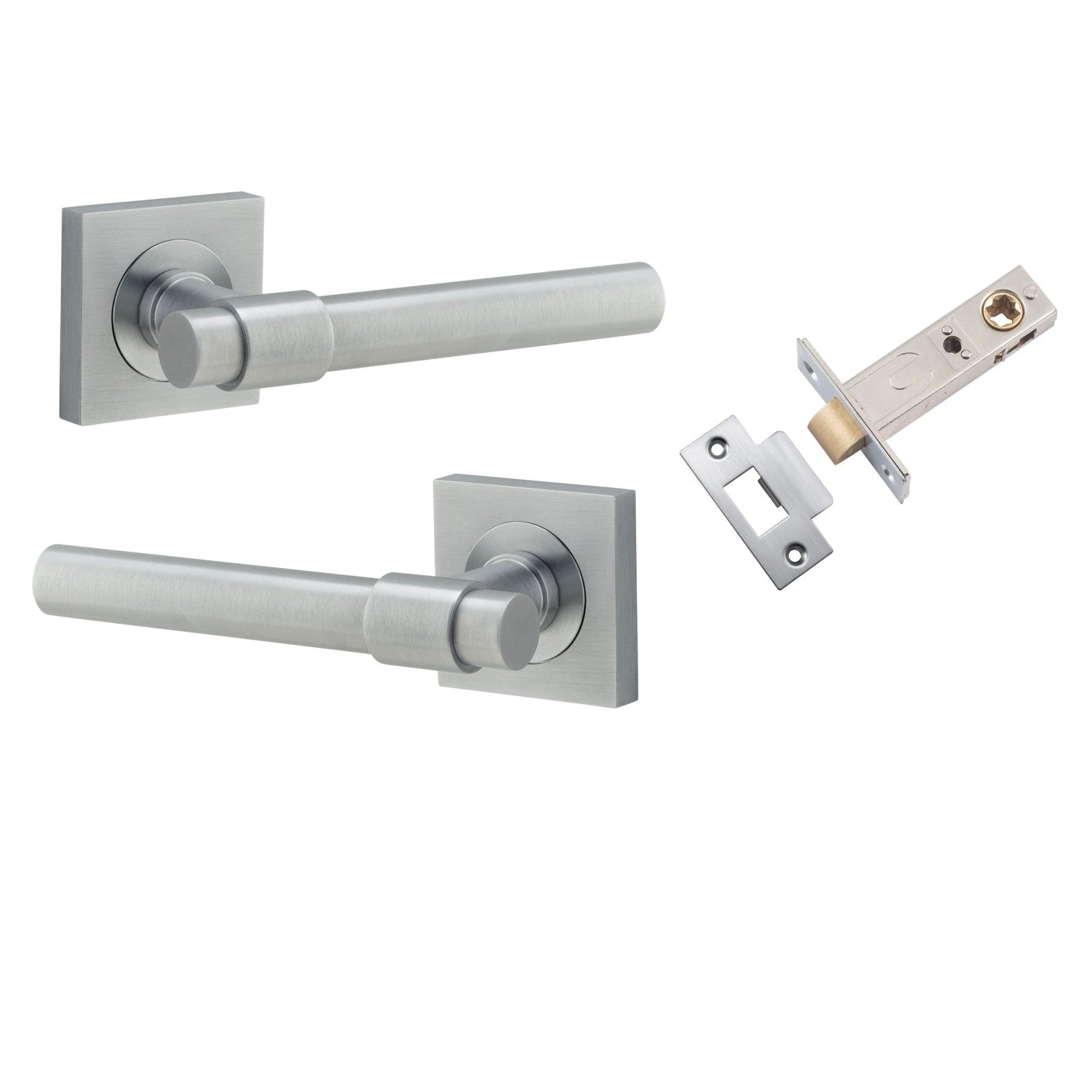 Included in Kit: Door Lever Helsinki Square Rose Brushed Chrome H52xW52xP44mm Passage Kit, Tube Latch Split Cam 'T' Striker Brushed Chrome Backset 60mm