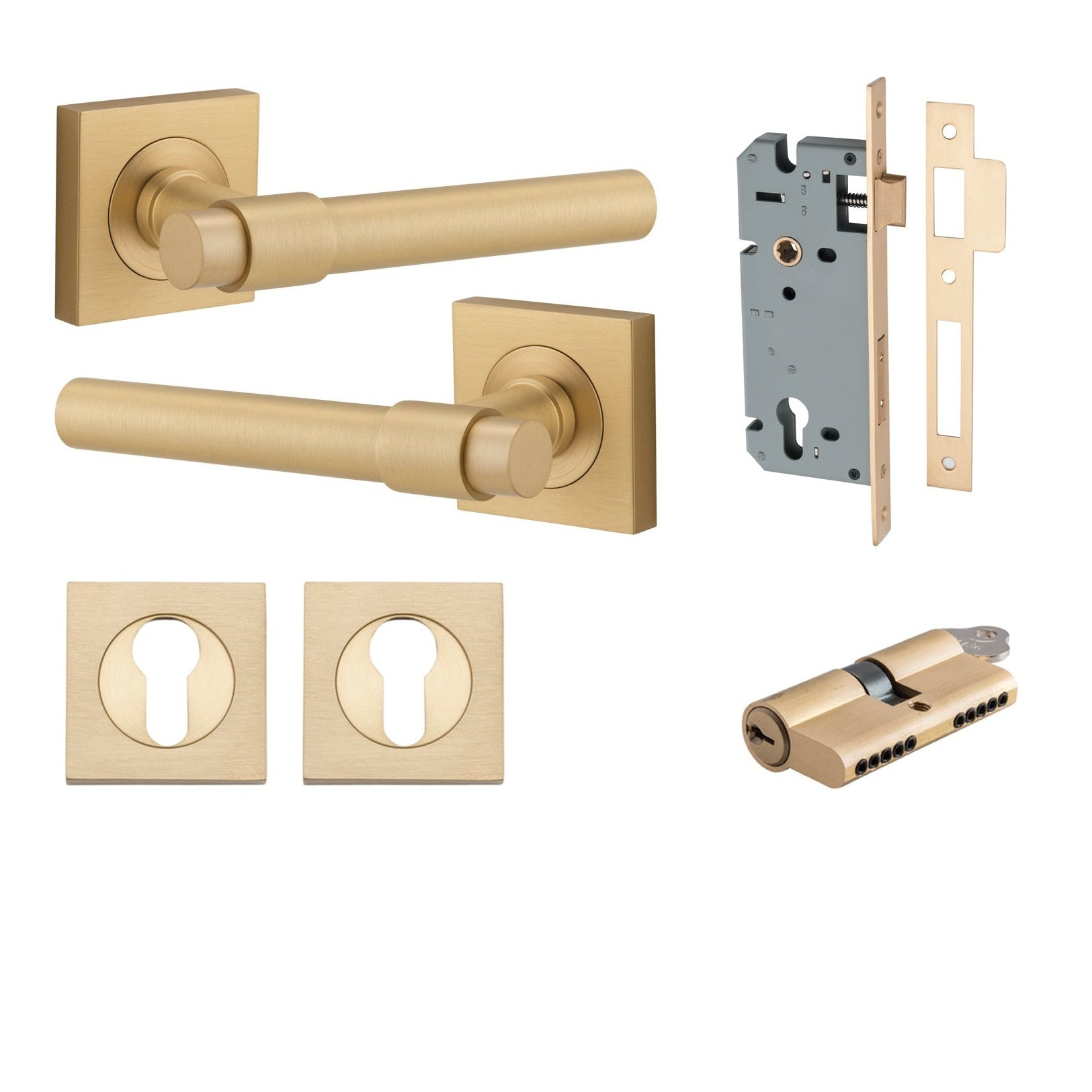 Included in Kit: Door Lever Helsinki Square Rose Brushed Brass H52xW52xP44mm Entrance Kit, Mortice Lock Euro Brushed Brass CTC85mm Backset 60mm, Euro Cylinder Dual Function 5 Pin Brushed Brass L65mm KA1, Escutcheon Euro Concealed Fix Square Pair Brushed Brass H52xW52xP10mm