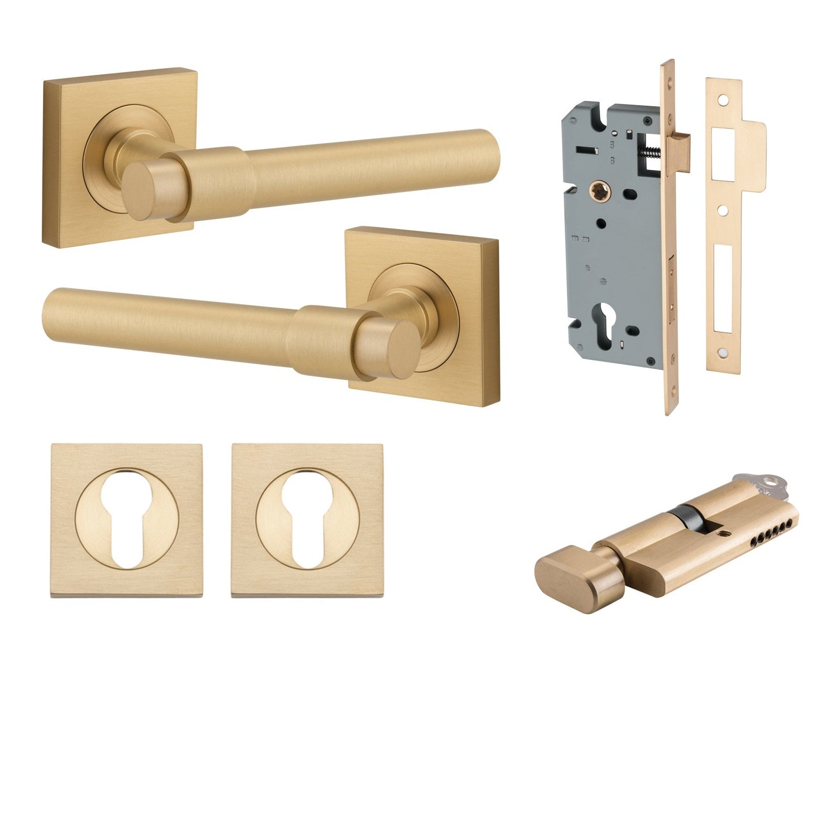 Included in Kit: Door Lever Helsinki Square Rose Brushed Brass H52xW52xP44mm Entrance Kit, Mortice Lock Euro Brushed Brass CTC85mm Backset 60mm, Euro Cylinder Key Thumb 6 Pin Brushed Brass L70mm KA1, Escutcheon Euro Concealed Fix Square Pair Brushed Brass H52xW52xP10mm