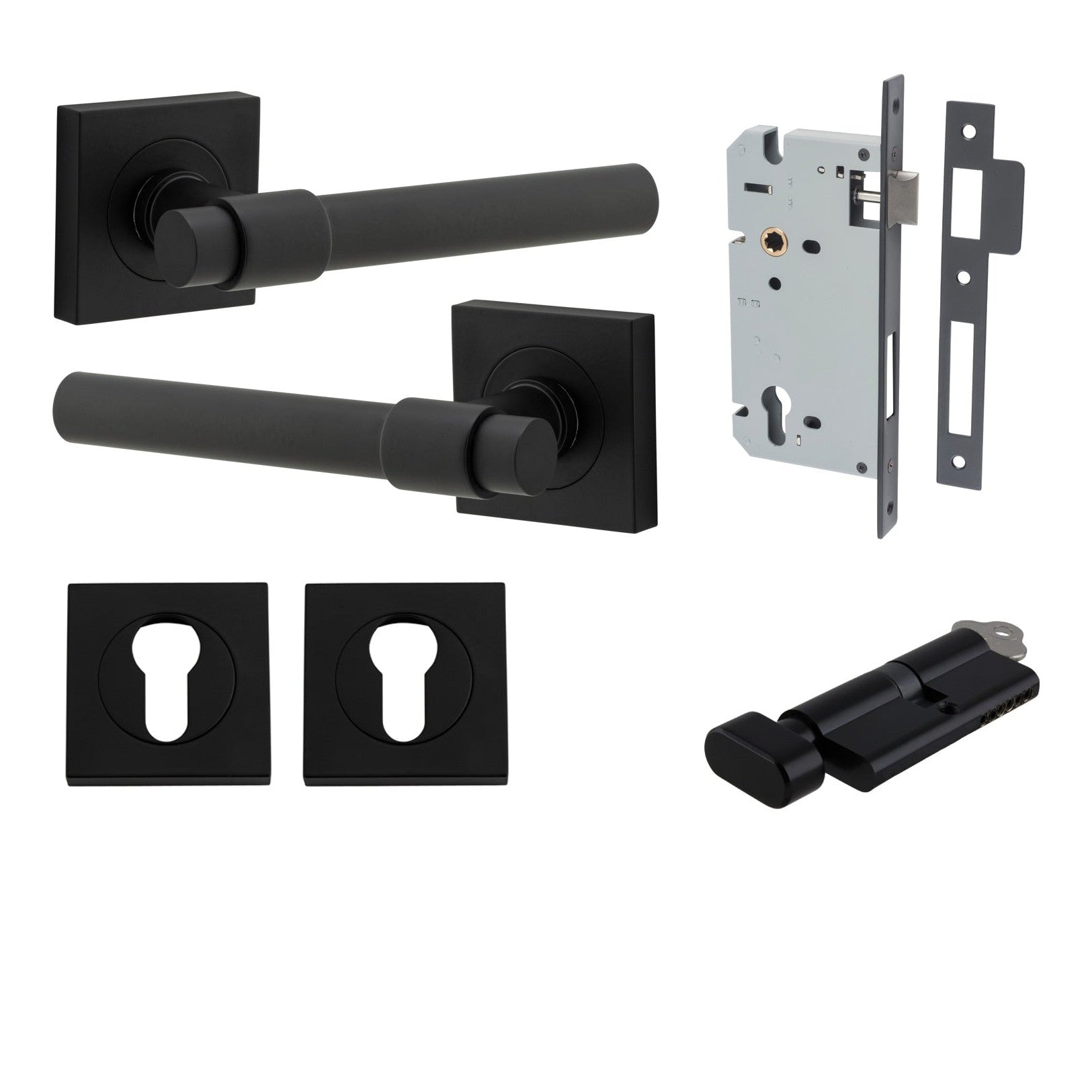 Included in Kit: Door Lever Helsinki Square Rose Matt Black H52xW52xP44mm Entrance Kit, Mortice Lock Euro Matt Black CTC85mm Backset 60mm, Euro Cylinder Key Thumb 6 Pin Matt Black L70mm KA1, Escutcheon Euro Concealed Fix Square Pair Matt Black H52xW52xP10mm