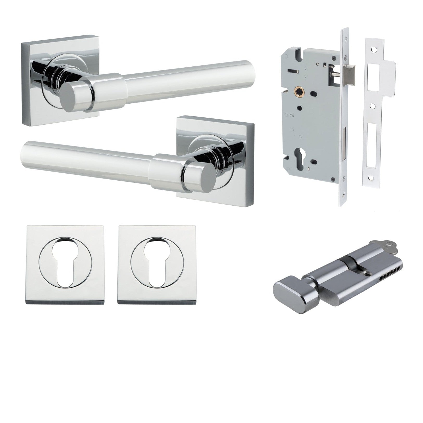 Included in Kit: Door Lever Helsinki Square Rose Polished Chrome H52xW52xP44mm Entrance Kit, Mortice Lock Euro Polished Chrome CTC85mm Backset 60mm, Euro Cylinder Key Thumb 6 Pin Polished Chrome L70mm KA1, Escutcheon Euro Concealed Fix Square Pair Polished Chrome H52xW52xP10mm