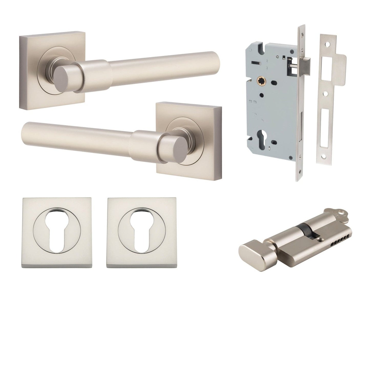 Included in Kit: Door Lever Helsinki Square Rose Satin Nickel H52xW52xP44mm Entrance Kit, Mortice Lock Euro Satin Nickel CTC85mm Backset 60mm, Euro Cylinder Key Thumb 6 Pin Satin Nickel L70mm KA1, Escutcheon Euro Concealed Fix Square Pair Satin Nickel H52xW52xP10mm