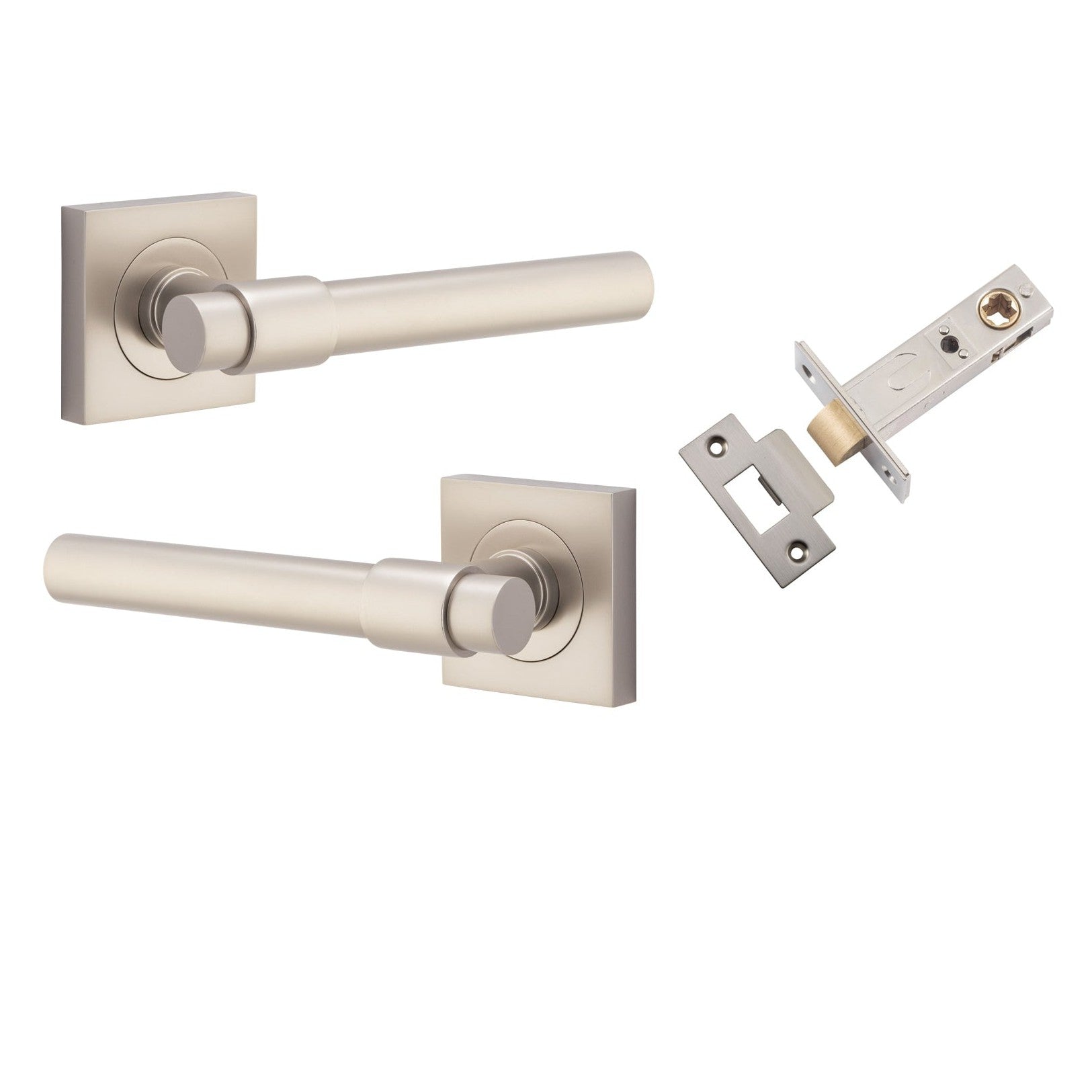 Included in Kit: Door Lever Helsinki Square Rose Satin Nickel H52xW52xP44mm Passage Kit, Tube Latch Split Cam 'T' Striker Satin Nickel Backset 60mm