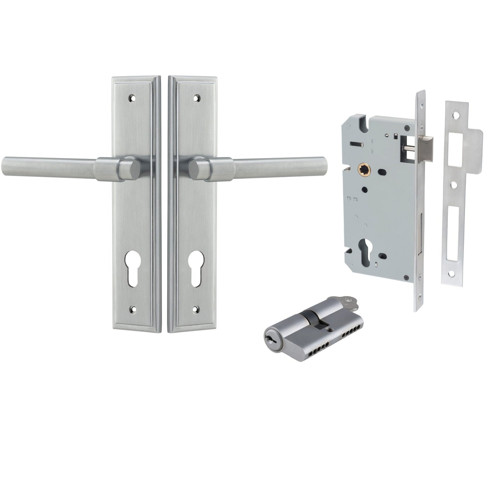 Included in Kit: Door Lever Helsinki Stepped Euro Pair Brushed Chrome CTC85mm H237xW50xP44mm Entrance Kit, Mortice Lock Euro Brushed Chrome CTC85mm Backset 60mm, Euro Cylinder Dual Function 5 Pin Brushed Chrome L65mm KA1