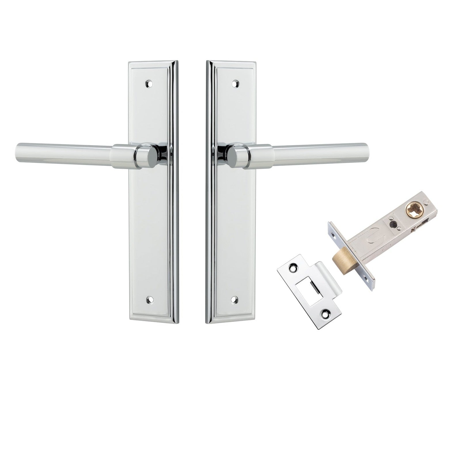 Included in Kit: Door Lever Helsinki Stepped Latch Pair Polished Chrome H237xW50xP44mm Passage Kit, Tube Latch Split Cam 'T' Striker Polished Chrome Backset 60mm