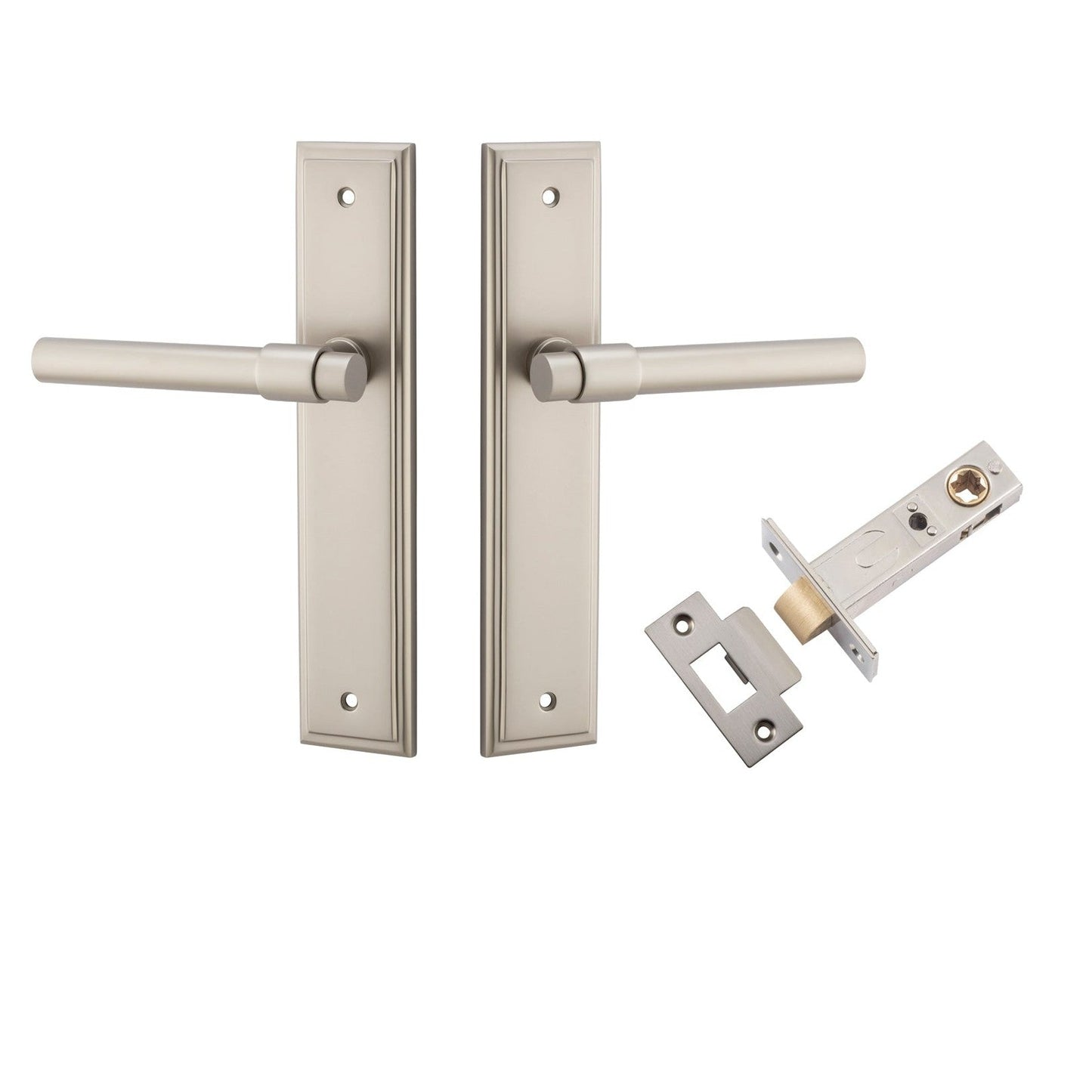 Included in Kit: Door Lever Helsinki Stepped Latch Pair Satin Nickel H237xW50xP44mm Passage Kit, Tube Latch Split Cam 'T' Striker Satin Nickel Backset 60mm
