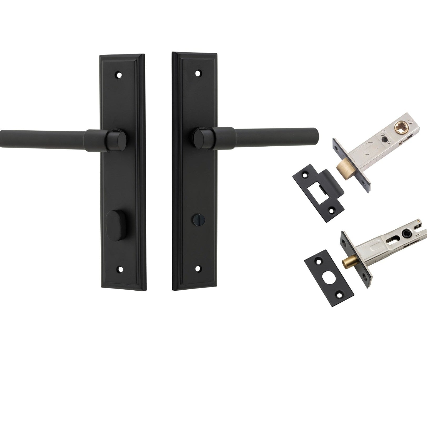 Included in Kit: Door Lever Helsinki Stepped Privacy Pair Matt Black CTC85mm H237xW50xP44mm Inbuilt Privacy Kit, Tube Latch Split Cam 'T' Striker Matt Black Backset 60mm, Privacy Bolt Round Bolt Matt Black Backset 60mm