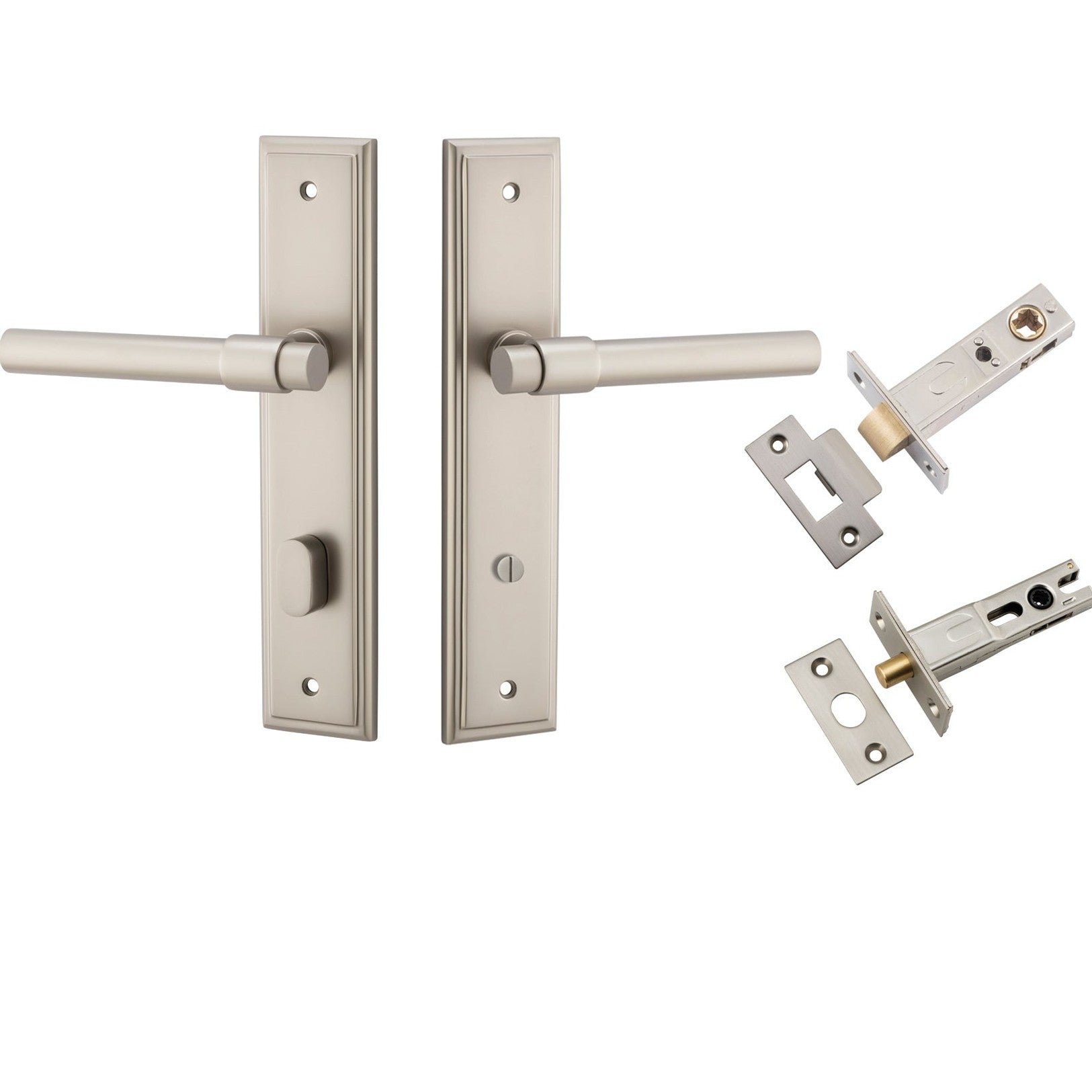 Included in Kit: Door Lever Helsinki Stepped Privacy Pair Satin Nickel CTC85mm H237xW50xP44mm Inbuilt Privacy Kit, Tube Latch Split Cam 'T' Striker Satin Nickel Backset 60mm, Privacy Bolt Round Bolt Satin Nickel Backset 60mm