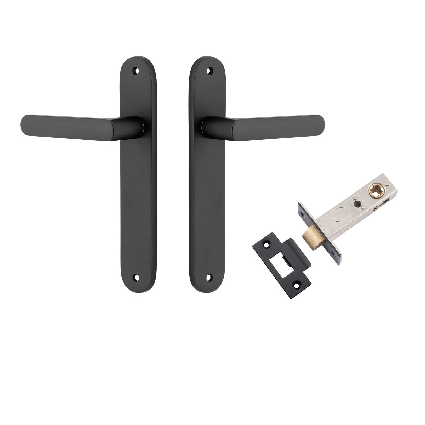 Included in Kit: Door Lever Osaka Oval Latch Pair Matt Black H240xW40xP55mm Passage Kit, Tube Latch Split Cam 'T' Striker Matt Black Backset 60mm