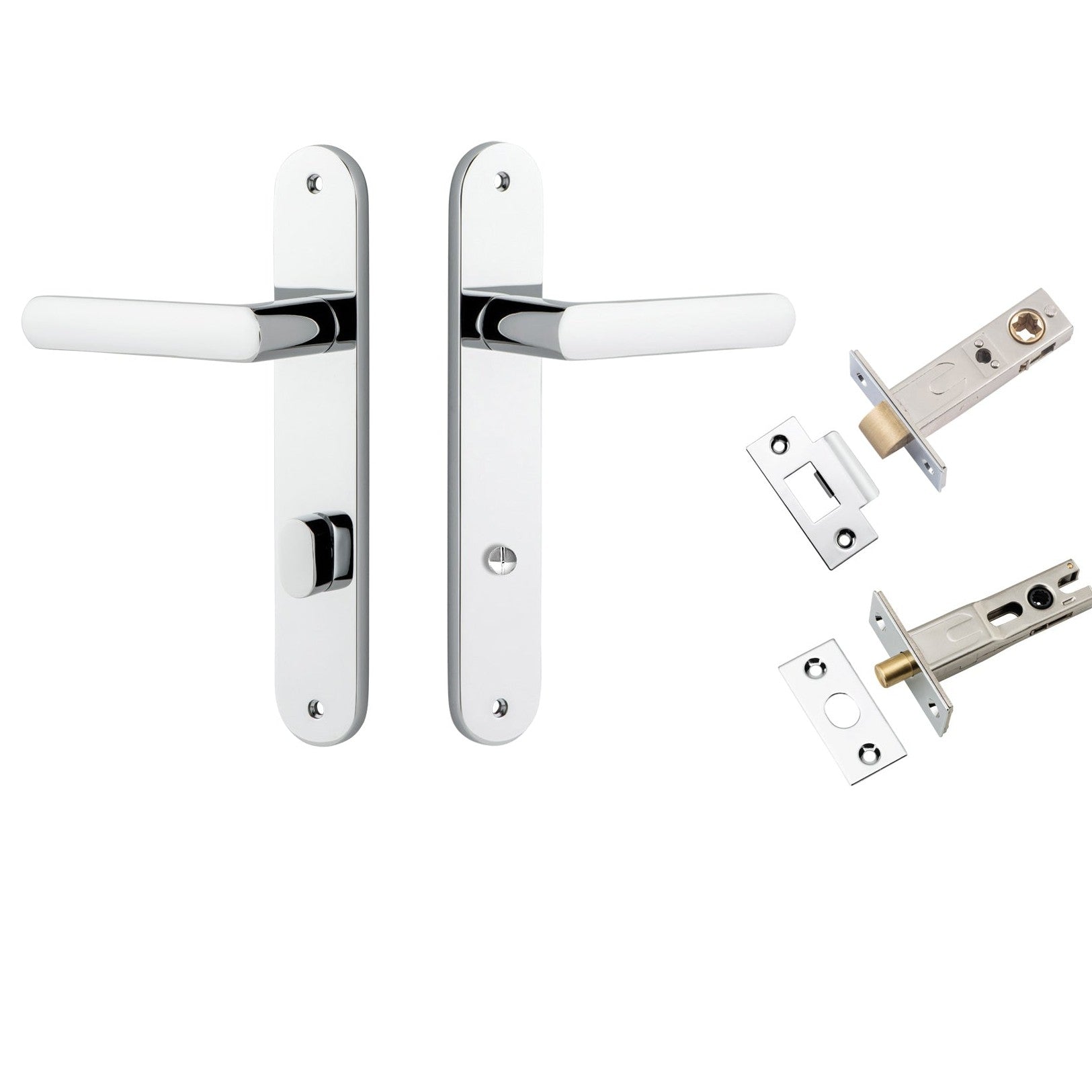 Included in Kit: Door Lever Osaka Oval Privacy Pair Polished Chrome CTC85mm H240xW40xP55mm Inbuilt Privacy Kit, Tube Latch Split Cam 'T' Striker Polished Chrome Backset 60mm, Privacy Bolt Round Bolt Polished Chrome Backset 60mm