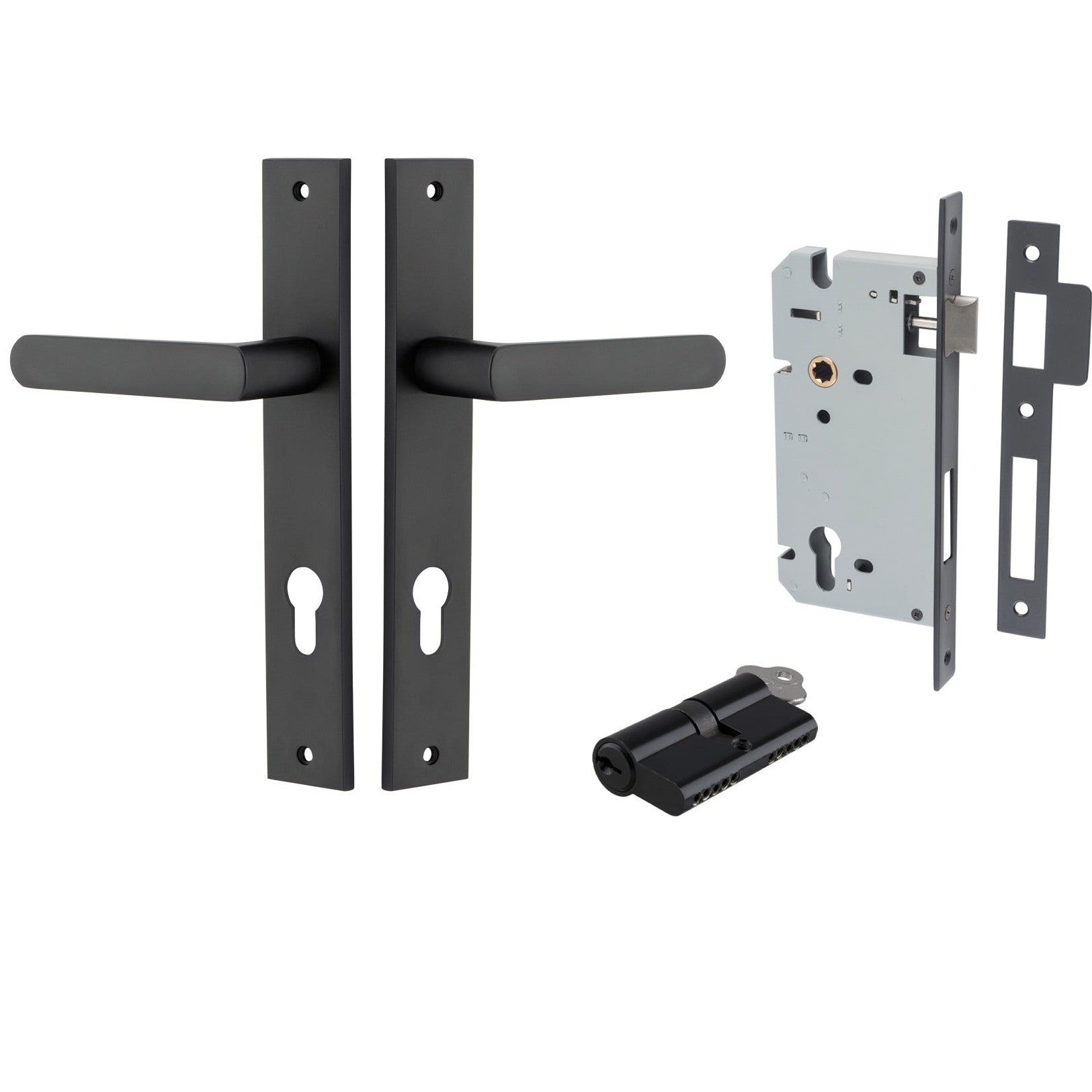 Included in Kit: Door Lever Osaka Rectangular Euro Pair Matt Black CTC85mm H240xW38xP55mm Entrance Kit, Mortice Lock Euro Matt Black CTC85mm Backset 60mm, Euro Cylinder Dual Function 5 Pin Matt Black L65mm KA1