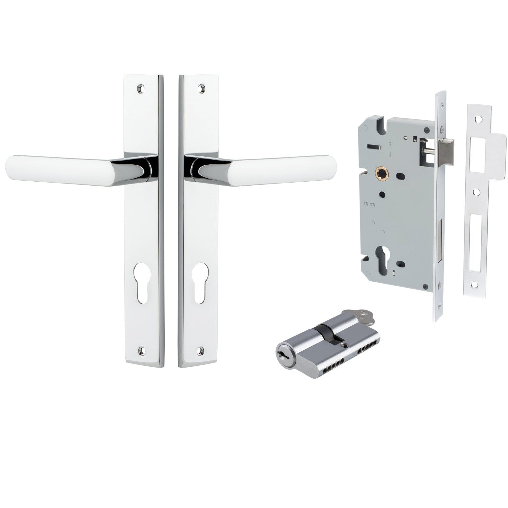 Included in Kit: Door Lever Osaka Rectangular Euro Pair Polished Chrome CTC85mm H240xW38xP55mm Entrance Kit, Mortice Lock Euro Polished Chrome CTC85mm Backset 60mm, Euro Cylinder Dual Function 5 Pin Polished Chrome L65mm KA1