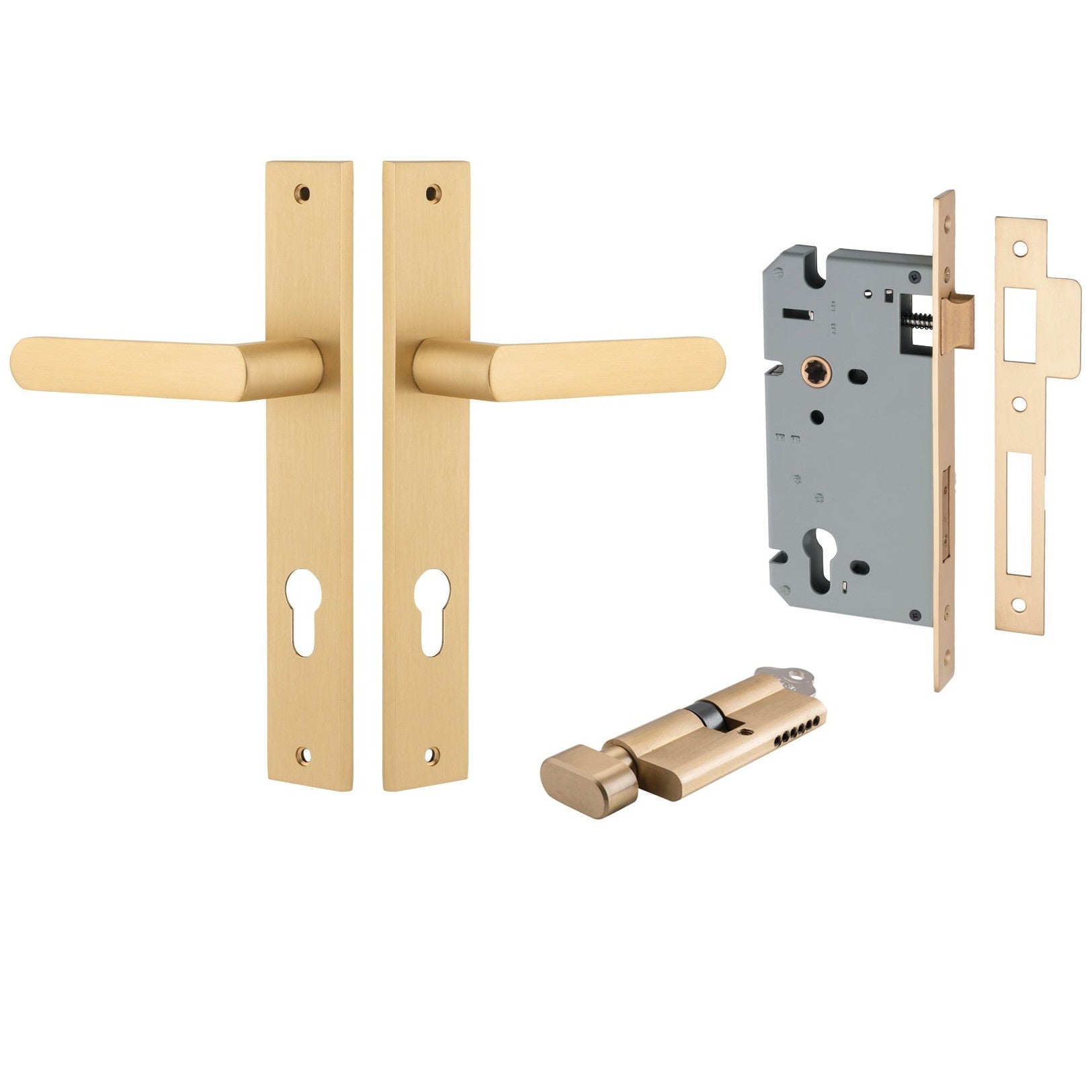Included in Kit: Door Lever Osaka Rectangular Euro Pair Brushed Brass CTC85mm H240xW38xP55mm Entrance Kit, Mortice Lock Euro Brushed Brass CTC85mm Backset 60mm, Euro Cylinder Key Thumb 6 Pin Brushed Brass L70mm KA1
