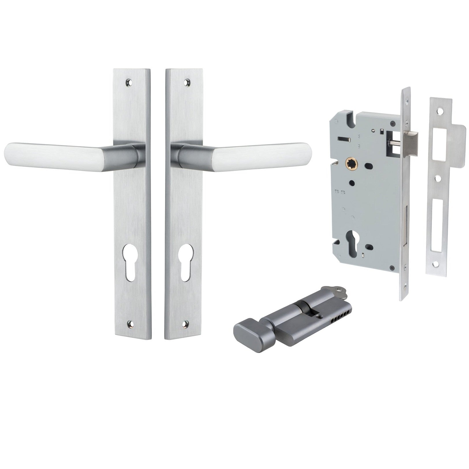 Included in Kit: Door Lever Osaka Rectangular Euro Pair Brushed Chrome CTC85mm H240xW38xP55mm Entrance Kit, Mortice Lock Euro Brushed Chrome CTC85mm Backset 60mm, Euro Cylinder Key Thumb 6 Pin Brushed Chrome L70mm KA1