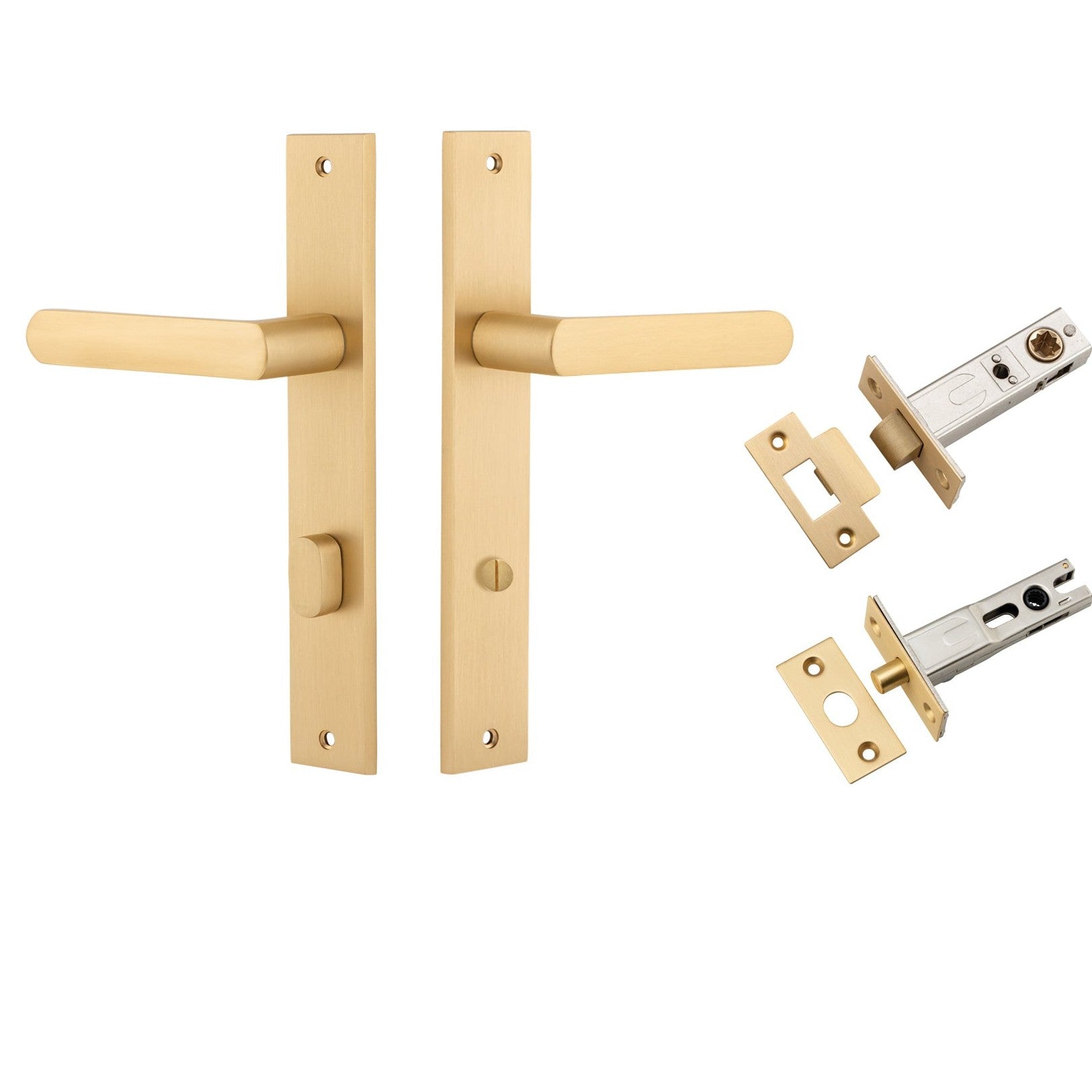 Included in Kit: Door Lever Osaka Rectangular Privacy Pair Brushed Brass CTC85mm H240xW38xP55mm Inbuilt Privacy Kit, Tube Latch Split Cam 'T' Striker Brushed Brass Backset 60mm, Privacy Bolt Round Bolt Brushed Brass Backset 60mm