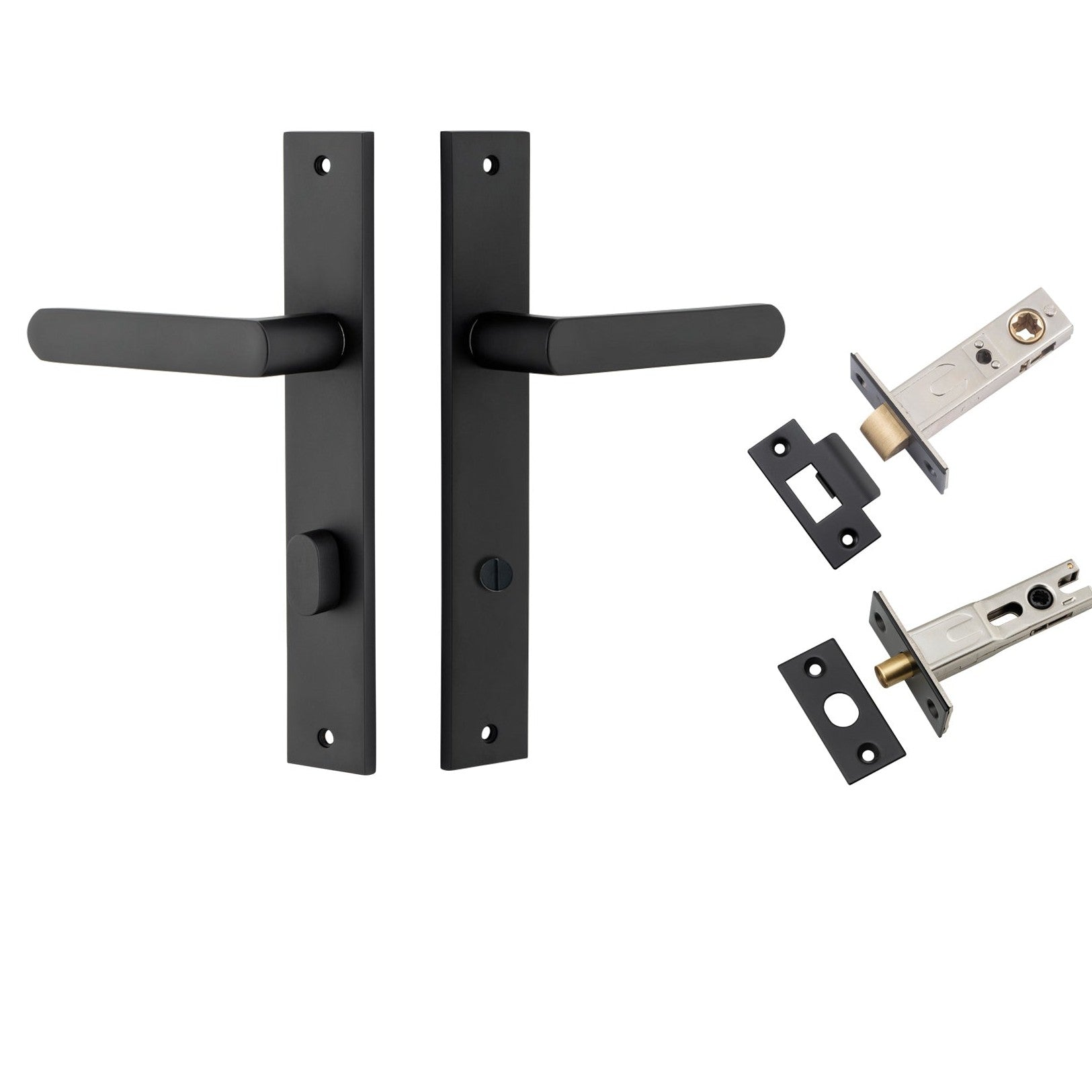 Included in Kit: Door Lever Osaka Rectangular Privacy Pair Matt Black CTC85mm H240xW38xP55mm Inbuilt Privacy Kit, Tube Latch Split Cam 'T' Striker Matt Black Backset 60mm, Privacy Bolt Round Bolt Matt Black Backset 60mm